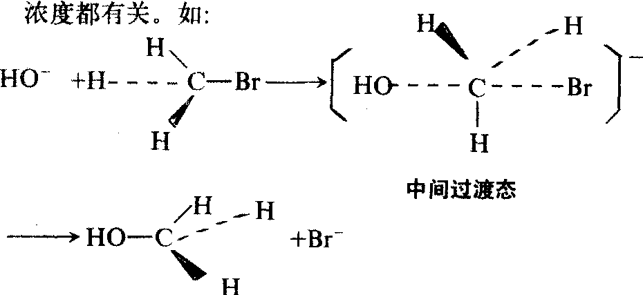 一级卤代烃的水解反应主要以双分子历程进行,氢氧根离子进攻与卤素原子相连接的碳原子,经中间过渡态,继而形成产物,其反应速度与卤代烃和碱的
