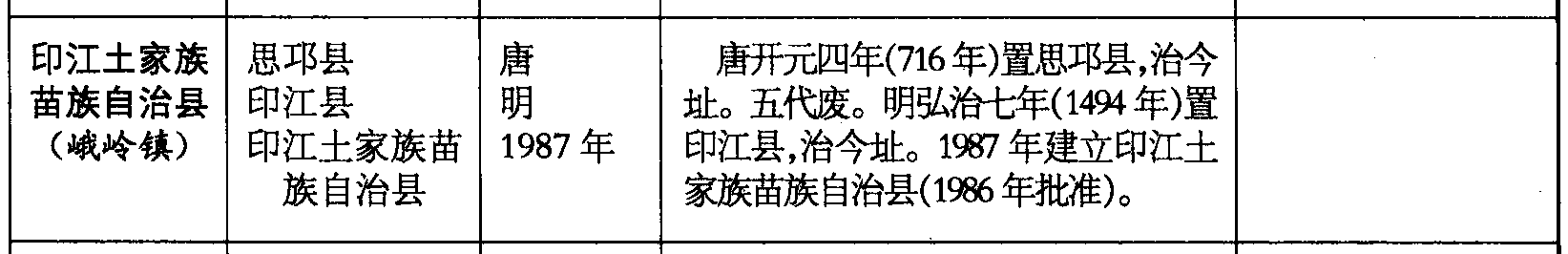 印江土家族苗族自治县(峨岭镇)思邛县印江县印江土家族苗族自治县唐明1987年唐开元四年(716年)置思邛县,治今址。五代废。明弘治七年(1494年)置印江县,治今址。1987年建立印江土家族苗族自治县(1986年批准)。