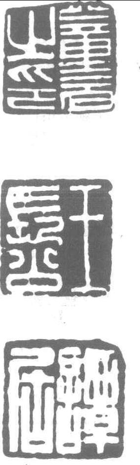 古璽 [印章之歷史] (1) 古璽——春秋戰國時代,印無官私、高下之分,稱為 “璽”,而不稱稱 “印”。是時之印為古璽。清末陳介祺編 《簠齋印集》時,為别於秦漢印章,特置古璽於卷頭。古璽鈕式無論官私,多為壇鈕,而玉璽為覆斗鈕,私璽有鼻鈕、代鈕、亭鈕、烏鈕、默鈕諸類形式,製作精巧。古璽形式獨特,其文字舆 “古泉文”、“古匋文”不同。印制者間有共通文字,堪視為職種類别文字。對此尚欠考究。 (2) 秦印——秦始皇统一天下,建立中央集權官僚制國家。正式確定印製為: 官印方一寸,中有“田”字格,文字刻入格内。半通印《長方印》為“日”字格,私印、吉語印亦多界格。官私印之文字相通,書風近似小篆、權量銘。鈕式多為壇、覆、斗、鼻、魚。 (3) 漢印——前、東漢印之總稱。 ![]()