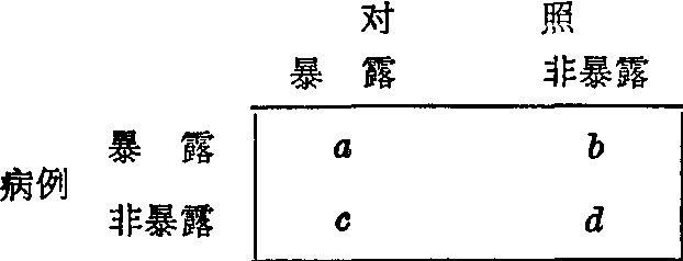 本资料说明男女荨麻疹史对慢性气管炎的发病有相关联系,公共相对危险度的点估计为2.13,其95%可信区间为1.29~3.50。 配对病例对照研究 在这类研究中,对每一病例配以性别、年龄或其他有关条件相似的一个或几个对照,然后比较病例和对照以往暴露于致病因素的经历。在1:1配对情况下,每个对子的调查结果必属于下列四种情况之一: ❶病例和对照均暴露(对子数为a), ❷病例和对照均非暴露(对子数为d), ❸病例暴露而对照非暴露(对子数为b), ❹病例非暴露而对照暴露(对子数为c)。调查结果可整理如下: