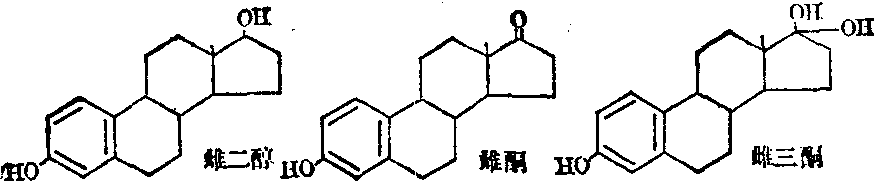 图2 三种雌激素的结构式 雌激素是能引起实验动物动情物质的总称。从人体中已提取出近20种天然雌激素,对其中了解较多的是17β-雌二醇(17β-estradiol)。雌酮(estrone),及雌三醇(est-ciol)。雌二醇的活性最强,雌酮和雌三醇的活性仅为雌二醇的1/10和1/1000。 雌激素可增加子宫去氧核糖核酸 (deoxyribonucleicacid,DNA)、蛋白质的合成,加速细胞分裂,细胞增生与肥大,使子宫内膜发生增殖变化(内膜增厚,腺体、血管和基质细胞增生)。也可促进子宫肌增生,增加肌细胞内肌纤蛋白和肌凝蛋白的含量。在雌激素的作用下子宫肌的膜电位增加,动作电位发放频率增加,子宫肌自发收缩增加,对催产素的敏感性也增加;宫颈分泌大量清亮稀薄的粘液,易拉成丝,内含大量多糖和硫氢基,有利于精子穿透,干燥后出现羊齿植物样结晶;阴道上皮增生,糖元含量增加,粘膜增厚出现皱折,阴道表浅上皮细胞角化,可据以判断体内雌激素的水平;也促进大、小阴唇的发育。小剂量的雌激素可增加输卵管运动,促进卵的输送; 但较大剂量则可使输卵管峡部环形肌持续收缩延缓卵的输送。雌激素还可促进乳腺导管增生,乳头乳晕色素增加; 并可促进卵的发育和延长黄体的寿命,雌激素对下丘脑中枢有反馈作用,小剂量(约30~40μg)可促进LH的分泌,剂量超过80μg时可抑制LH分泌和排卵,这是复方避孕药的主要作用机理。雌激素也作用于下丘脑的血管运动中枢,如绝经时由于雌激素含量减少,血管运动中枢不稳定,妇女常出现面部潮红、夜汗等,而用雌激素则可减轻症状。 在代谢方面,雌激素促进骨钙沉积,降低骨胳对内源性甲状旁腺的反应性,抑制破骨细胞的活动,因而在青春早期女孩生长较快,但同时又促使骨骺闭合,故不能使身高明显增加。绝经后由于雌激素缺乏,骨质吸收加速而造成骨质疏松,引起脊椎压缩,出现老年性弯曲。雌激素可降低血浆胆固醇和胆固醇磷脂之比,α-脂蛋白显著增加,β-脂蛋白减少,有利于抑制冠心病的发展。雌激素也影响体脂分布,形成女性特有的体态。此外,还能促进血管内液体转移到组织间隙,使血容量减少,引起醛固酮分泌,促进肾小管水和钠的重吸收,经前期紧张症的水肿与之有关。 孕激素是在切除卵巢黄体后能维持妊娠的化合物的总称。活性最强的是孕酮(progesterone),此外还有20α-羟孕酮与17α-羟孕酮,其他都是这三种孕激素合成过程中的中间或代谢产物。孕激素主要作用于子宫内膜和子宫肌,有利于孕卵着床和维持妊娠。子宫孕酮受体受雌激素调节,故孕激素必须在雌激素作用的基础上才能发挥作用。孕酮使子宫内膜呈分泌期变化,有利于孕卵在宫内生存;促进子宫内膜间质细胞转化为蜕膜细胞,抑制母体免疫反应,减少子宫肌的自发活动,使子宫处于阻滞状态,有利于胚胎在宫内发育;使宫颈粘液减少变稠,拉丝度减少,中性多糖含量减少,精子难以穿过。在孕酮作用下阴道涂片出现褶卷的嗜碱性细胞,在雌激素的配合下孕酮促进乳腺腺泡发育,孕酮有拮抗醛固酮作用促进尿钠的排泄,但这又代偿性地引起醛固酮的分泌而最后导致水和钠的潴留。孕酮直接作用于下丘脑的体温调节中枢,提高定点的水平或通过甲状腺素产热作用的增高使基础体温升高,因而可用黄体期基础体温升高作为排卵的指标。孕酮使子宫、血管和消化道平滑肌的紧张性下降,因此在妊娠时易发生静脉曲张、痔、便秘、输尿管积水等情况。 卵巢间质细胞和肾上腺皮质都能分泌少量雄激素。雄激素与雌激素的适量配合使阴毛和体毛呈正常女性分布。 雌激素主要在卵泡的内膜细胞合成,颗粒及内膜黄体细胞也能合成。妊娠时胎盘滋养层合体细胞也能分泌大量雌激素特别是雌三醇。成年妇女月经中期雌二醇的产生率为250~500ng/24h,血雌二醇浓度卵泡期为50pg/ml,排卵前期为250pg/ml,黄体期为129pg/ml,血中雌激素大部与性激素结合球蛋白(sex hormone bindingglobulin) 结合,少量为游离形式具有生物活性。雌二醇、雌酮主要在肝脏转化为雌三醇或16-表雌三醇,2-羟基雌酮等,以葡萄糖醛酸甙或硫酸盐的形式由尿排出。 卵巢黄体细胞、胎盘能分泌大量孕酮,卵巢颗粒细胞和内膜细胞分泌少量。孕酮的产生率,滤泡期为2.6mg/24h,黄体期22ng/24h,妊娠末期300mg/24h。血孕酮浓度,滤泡期0.5ng/ml,黄体期10~20ng/ml,妊娠晚期200ng/ml。血中90%的孕酮为结合形式,一半与白蛋白结合,另一半与皮质甾体结合蛋白结合。17α-羟孕酮由黄体分泌,排卵时呈一个峰,是判断黄体功能的重要指标。 孕酮为体内其他甾体激素的前身可形成各种有活性的代谢产物。孕酮主要在肝脏灭活,还原为孕烯二醇酮、孕烯二醇、孕烯三醇。从尿中排出。 雌、孕、雄激素的合成途径是类似的,都是由胆固醇(来自血浆或细胞利用乙酸盐合成的)转化而成。胆固醇在羟化酶作用下,在辅酶Ⅱ和分子氧存在下在20α和22R位羟化,后者在20、22裂解酶作用下形成孕烯醇酮(pre-gnenlone)。孕烯醇酮是合成一切甾体激素的关键性中间体。在异构酶作用下它可转变双键的位置 (将5、6碳原子之间变为位于4、5碳原子之间),在3β羟甾体脱氢酶作用下将3位的羟基转变为酮基形成孕酮。另外孕烯醇酮在17-羟化酶作用下可转化为17-羟孕烯醇酮,后者在裂解酶作用下除去20、21位碳原子产生脱氢表雄酮(dehydroepiandrosterone);在异构酶和3β羟甾体脱氢酶作用下形成雄烯二酮(androstenedione);在17-羟化甾体脱氢酶作用下,雄烯二