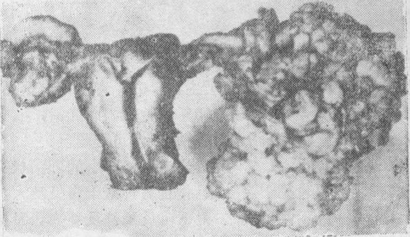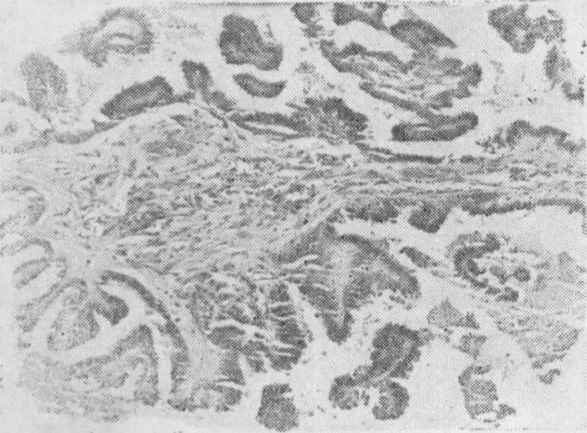 图1 卵巢浆液性乳头状囊腺瘤 交界性浆液性囊腺瘤 是一种在外观上与良性浆液性囊腺瘤无明显区别而在组织学及生物学特性上介于良性与恶性之间的肿瘤(图2)。它可以复发及有大网膜及腹膜种植,但其预后较恶性者好,10年存活率为95%,大体检查,双侧的交界性浆液性囊腺瘤较良性者多见,乳头状物的数目亦较良性者多,有时可穿破包膜达肿瘤表面。镜下可见 ❶乳头上皮增生而成上皮簇。 ❷上皮细胞呈复层(不超过三层),有轻或中度间变。 ❸可见核分裂相,但每高倍视野不超过一个。 ❹无肿瘤间质浸润。