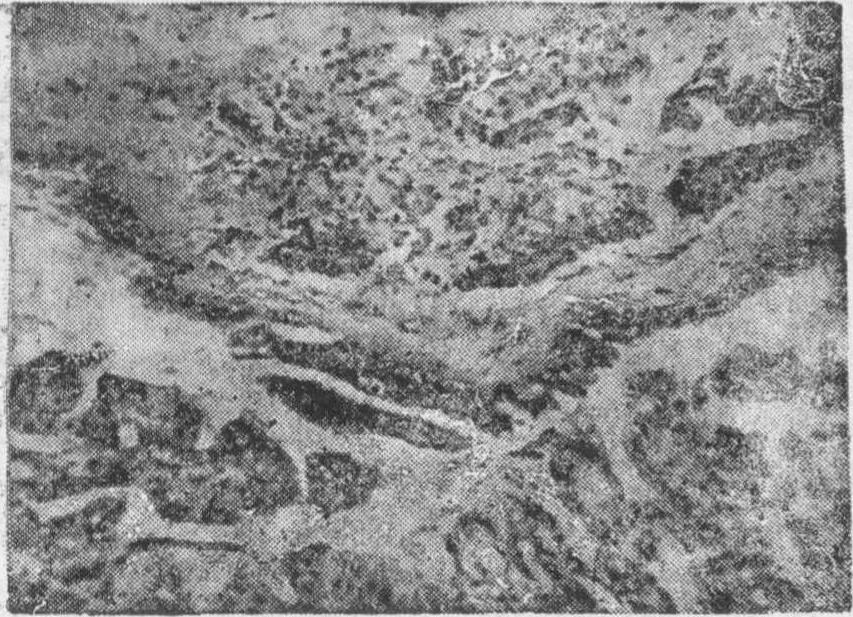 图4 卵巢浆液性乳头状囊腺癌 该肿瘤部分囊性,部分为实性。囊内乳头多,囊壁表面亦可有乳头,包膜不完整、肿瘤切面常有出血、坏死,可见血性或混浊的积液。镜下可见囊壁及乳头的被覆上皮明显增生,细胞在中层以上,排列紊乱,极性消失,大小不一致。细胞核大,染色质粗大而分布不匀,有核分裂相。癌细胞浸润间质及包膜。乳头分枝多,可互相融合成实性团块,也可为筛状结构,并可见砂粒体。 浆液性囊腺癌生长快,腹腔内转移发生早,就诊时半数以上已属晚期,5年存活率约为25%。 浆液性肿瘤的诊断和治疗见“卵巢肿瘤” ☚ 卵巢生发上皮来源的肿瘤 卵巢粘液性肿瘤 ☛ |