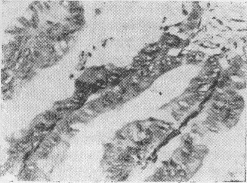 图2 卵巢交界性粘液性乳头状囊腺瘤 卵巢粘液性囊腺瘤破裂或经穿刺内容物流出后,瘤细胞可种植于腹膜上产生大量粘液,形成假粘液性腹膜炎。患者常诉腹胀,腹围增大,消瘦,甚至呈恶病质。此种种植病灶不易用手术清除,即使能割除多数病例再发。 粘液性囊腺癌 占卵巢恶性肿瘤的3~10%,多发生于40~60岁。 肿瘤为囊性,但有明显的实质区,直径可达50cm,表面光滑,有时有包膜浸润,与周围组织或器官粘连,切面亦为多房性,常有出血坏死。囊内容物多为混浊或血性。镜下可见上皮细胞增生明显,多在四层以上,排成蜂窝状或呈乳头状,其层次紊乱,极性丧失,细胞大小不一,有明显间变,胞浆内的粘液不明显,有时分泌旺盛形成粘液湖,可见核分裂相(图3)。