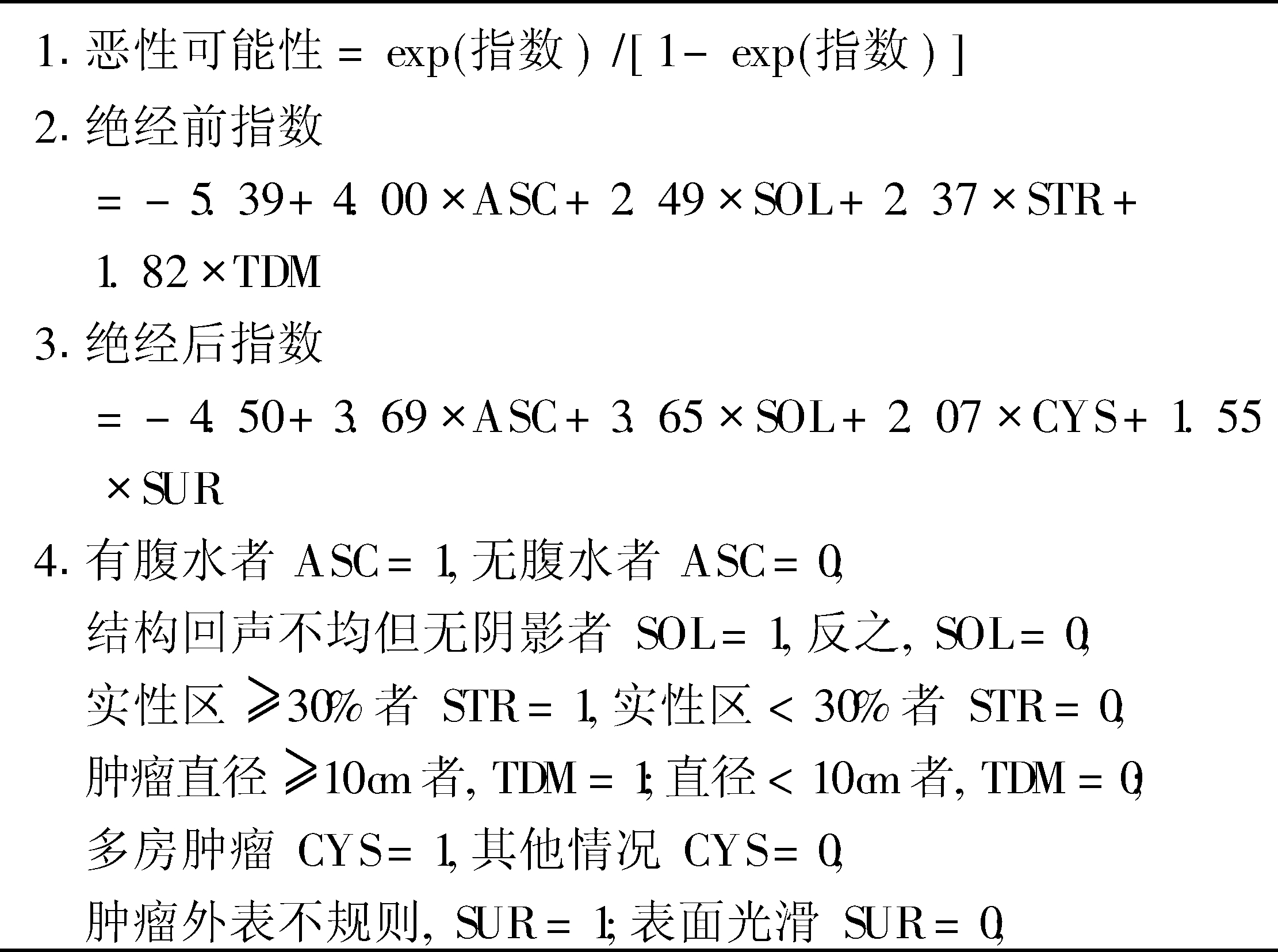 | 释义 | 卵巢肿瘤评分系统 卵巢肿瘤评分系统score system of ovarian tumor为更好地筛查和评判卵巢肿瘤,现将几种评价方法分别介绍。见表1~7。 表1 Depriest超声评分系统(1993) Depriest所制定的超声评分系统主要用于卵巢癌筛查。3220例被筛查者中44例(1.4%)存在卵巢形态或体积异常,其中评分>5的有9例行剖腹探查,3例术后病理证实为卵巢癌。 表2 Benacerraf超声评分系统(1994) 表3 Jacobs恶性危险指数评分系统(1996) 表4 Prompeler的“恶性可能性”计算方法(1997) Caruso等自行设计了一种CDFI诊断评分标准(见表5)。良性肿瘤和恶性肿瘤的平均血管评分分别是1.06±1.97和8.34±1.12(P<0.001)。规定评分≥5者为可疑卵巢癌。诊断的敏感性、特异性、阳性预测值和阴性预测值分别是100%,92%,72%和100%。 表5 Caruso彩色多普勒血流和频谱分析评分(1996) 表6 Sassone评分系统 表7 Lerner评分系统 ☚ 卵巢肿瘤面容 子宫内膜异位症的分期 ☛ |