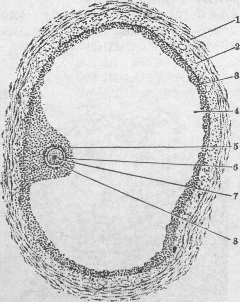 图2 成熟卵泡 1.卵泡膜外层 2.卵泡膜内层 3.粒层 4.卵泡腔 5.卵丘 6.放射冠 7.卵母细胞 8.透明带 次级卵泡和排卵前的成熟卵泡具有内分泌功能。目前认为,卵泡细胞合成与分泌孕酮。孕酮弥散到卵泡膜内层,在内层细胞17α-羟化酶的作用下转化为雄烯二酮或睾酮,又在卵泡细胞芳香化酶系的作用下转化为雌激素。 排卵 成熟卵泡破裂并排出卵细胞的过程称排卵。育龄妇女除妊娠外,每隔28天左右排卵一次。排卵的时间相当于月经周期第14天。两侧卵巢交替排卵,每次排卵一个,有时一次排两个或两个以上。排卵受丘脑下部和垂体分泌的激素控制。丘脑下部产生的促性腺激素释放激素,通过丘脑下部垂体门脉系到达垂体前叶,使前叶细胞分泌卵泡刺激素和黄体生成素。它们作用于卵巢使卵泡发育成熟并排出卵。排卵时这两种激素在血浆中的浓度都升高。在成熟卵泡后期,卵泡液增多,使卵泡更向卵巢表面突出,卵细胞及其周围的卵泡细胞脱离卵丘而浮游在卵泡液中。在卵泡突出处的卵巢表面上皮、白膜、和卵泡壁变薄,因此部很薄和缺血,形成一个透明的小卵圆区,称卵泡小斑。该处的胶原纤维被胶原酶和蛋白酶解聚,导致卵泡小斑和卵泡一起破裂,于是卵母细胞及其周围的透明带和放射冠随卵泡液一起从卵巢排出,进入输卵管。 ☚ 卵子发生 黄体 ☛ |