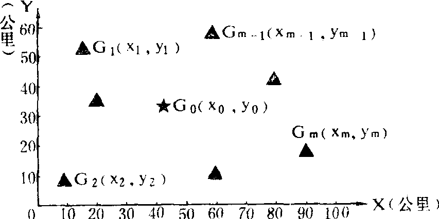 图中: Gi (i=1,2,……,m) 为某运输点的运输数量,(xi,yi) 为该运输点的坐标位置; 然后,用“重心”计算公式求出拟建项目的最小运费点 (x0,y0),此点即理论上的厂址座标,其公式为: