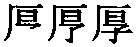 ☚ 覃 畗部 ☛ 厚hòu甲骨文和西周金文中是会意字。从厂(本读hǎn,本山岩形),从倒享(亯)。享本象宗庙形,祭祀供奉;厂也代表房屋。在房中不奉人而自奉,有丰厚、富厚义。《说文》说倒“享”字就是厚字。引申为长宽厚的厚。又是厚薄的厚。又表示深、重、浓、大义。如:厚望|厚味。又引申为不刻薄,待人好。如:厚道。 厚★常◎常