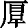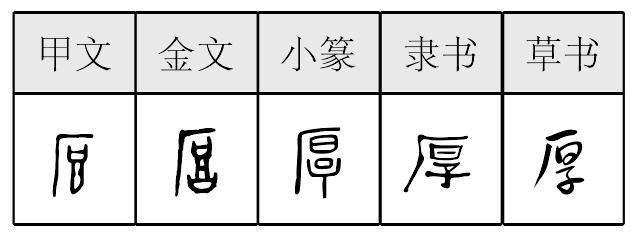 ❹ 得天独厚|恩高义厚|弘毅宽厚|局高蹐厚|踞高蹐厚|情深意厚|天高地厚|温柔敦厚|物薄情厚|宅心仁厚 厚厚,甲骨文作 ,金文作   ,《説文》古文作 ,小篆作 。 从厂 (hǎn)从𣆪。“𣆪” 即古 “厚”字, 或作 “㫗”,則 “厚”爲“㫗”字的增形。唐蘭説,“罈”“厚”古音相近,“𣆪”是 “罈”(覃)的初文。“厂”是石崖,《説文》據 “厚”字从厂而訓爲山陵之厚,當是又一義。文獻多表示豐厚、厚重、忠厚等義。卜辭多用作人名。銘文或用厚重、繁多、盛大等義,或用作氏族名、人名。 楚簡帛文作 ,字形多樣,多有訛變。秦簡牘文作 ,與小篆形近。 厚hòu(9画)