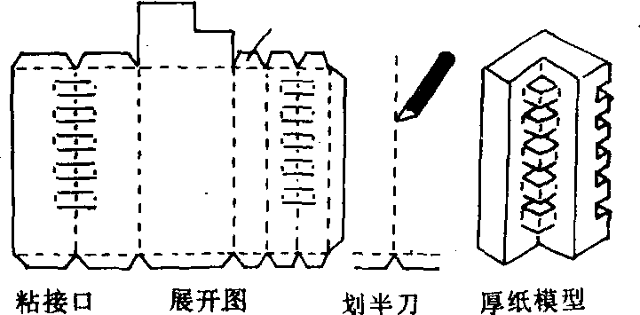 教学生利用白板纸、卡片纸草板纸,按照印好的展开图样剪裁制作,或自己设计展开图样剪裁制作,建筑物、交通工具或其他器物的立体模型的课业教学。由于厚纸模型要有仿真的视觉效果,所以,在设计展开图样时要严格按照前后、左右、上下几个对应面制图,在各面之间的折线处画虚线,在立体成型的接口处加画粘接边,小学低年级可制作简单的小纸箱、小纸盒、六面体模型,中、高年级可制作建筑模型、车船模型等,立方体、长方体的变形体,有的则是包括圆角、梯形、锥形的变形体,在设计一件厚纸模型时,可分成几部分组合成整体,每一部分相接的部位要有准确的尺寸标记。由于厚纸模型所用的纸张较硬,在指导学生制作时,要教会学生在虚线处划半刀,以便折线平直,如果纸张厚硬,要用乳胶粘接,厚纸模型教学的图样大多由教师设计油印在厚纸上,分发给学生使用,或使用市场出售的厚纸模型印刷品,学生们在课堂教学过程中主要是操作训练。在高年级的厚纸模型教学中也可让学生根据已有的图样先作成一件模型,如一座塔楼模型,再依据已有图样的结构方法,自己画出变形的楼房模型,用二、三课时完成一组建筑群体模型,既发挥了学生的创造性才能,又能达到审美教育目的(见彩页)。