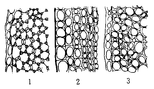 厚角组织的类型 1. 角隅厚角组织(南瓜茎) 2.板状厚角组织(接骨木茎) 3. 腔隙厚角组织(莴苣茎) 厚角组织机械组织的一种。由伸长的细胞壁不均匀加厚的活细胞组成,常具叶绿体,细胞壁不木质化。具支持功能,常见于茎、叶柄和花梗。 |