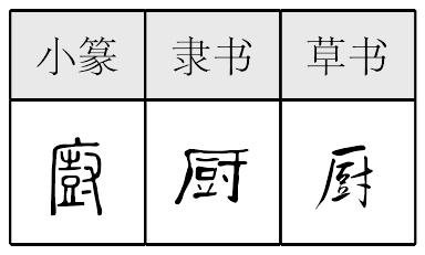 事官 事官执掌监督的官:监(监吏) 掌谏诤的官员:谏工 谏官 议官 言者言责 言官 言事官 管领太监的官:阉尸 处理具体事务的下级官吏:办事 掌旗帜的官:职志 古代的翻译官:舌人 主持官食的官:厨 为帝王主管膳食的官吏:宰臣 主管农事的官:稷 掌管粮仓的小官:委吏 掌管关市的官吏:关市 管理关市或守关口的官吏:关吏 古代州郡掌簿籍并负责上报的官员:计(计吏) 临察军务的官员:护戎 奉命外出宣慰、察访的官员:闲凉官 闲良官 侍讲官员:讲员 ☚ 官吏 文官 ☛ 厨廚;㕑chú直诛切,平虞。 ❶厨房。《孟子·梁惠王》:“是以君子远庖~。” ❷柜子。《晋书·顾恺之传》:“恺之尝以一~画,糊题其前,守桓玄。” 厨廚、厨chú厨房。 厨[廚、㕑]chú❶ (厨房) kitchen: 下 ~ go to the kitchen (to do cooking) ❷ [书] (宴席) banquet;feast ❸ [书] (柜子) closet;cabinet;wardrobe ❹ [书] (形状像橱的帐子) a bed-screen or mosquito net that looks like a small cabinet ◆厨房 kitchen;diet-kitchen;cuisine;cook house; 厨工 kitchen work;[旧] cook; 厨师 cook;[法] chef;chief (厨师长);master 厨 金文; 篆chú[廣(房屋,意符) +尌(聲符)→厨(《説文》:“厨,庖屋也。從广,尌聲。” 厨:做飯菜的房屋〈厨房〉。掌握做飯菜技術的人〈厨師〉,星級飯店則請“特級厨師”做菜。 至於家庭一日三餐,目前多爲家人自己做,叫“家常便飯”。過去把厨師稱爲“厨子”,實在不知道“烹飪學”是一門綜合性學科,首先它是以“營養學”爲基礎的。烹飪菜肴時要注意色、香、味、型和營養。厨師是有職稱的。烹飪學裏還包容著許多人生哲理,“鹽度〈不及不鮮,過之鹹苦〉”就是其中之一。)] 《孟子·梁惠王上》:“聞其〈牛、羊〉聲,不忍食其肉,是以君子遠庖厨也。”(聽到牛、羊的悲哀聲,就不忍心吃它們的肉,所以君子把厨房離開自己遠遠的。) 厨廚;㕑chú(12画)
