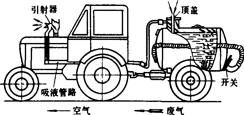 图1 自吸式厩液施洒机 引射器的结构和工作原理如图2所示。在吸肥过程中,柴油机排出的废气流经引射器,在工作喷嘴内流速增大,压力降低,从而使吸气室内的真空度增加;并通过吸气室接口所装的吸气胶管与液肥罐接通,使液肥罐内处于负压状态,液肥池内的液肥在大气压力作用下连续不断地流入罐内。当需要压出液肥时,将引射器改换为加压盖,通过加压胶管(与吸气管共用)使排气管与液肥罐直接连通,对液肥罐增压,加速液肥从尾管流出,并压送到一定高度。与小型拖拉机配用的自吸式厩液施洒机的压肥高度可达4米,吸满一罐需4~6分钟。
