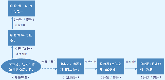 字源解说 本 字“升” 升,甲骨文 在“斗” (长柄勺)上加 ,表示酒斗在滴淌着酒。造字本义:将盛酒的酒斗从酒坛里提起。金文省去液滴的其中两点。篆文 严重变形,液滴形象消失。隶书 将字形横写,将金文勺中的点与手柄连写。长柄勺为“斗”,用斗打酒为“升”。 合并字“昇” 升,既是声旁也是形旁,表示将酒斗从酒坛提起。昇,篆文 = (日,太阳)+ (升,提起酒斗),表示太阳从地平线向上移动。造字本义:比喻早晨的太阳从地平线向上移动。在汉语词语“晋升”中,“晋”与“升”(昇)都有提高地位、级别的意思,但有被动与主动的不同:“晋”是被君主或上级赏识而提级;“升”(昇)是自身向前发展而提高自己的级别。 升 文言版《説文解字》:升,十龠也。从斗,亦象形。 升 白话版《说文解字》:升,十龠的量。字形以“斗”为字根,也是象形字。 昇 文言版《説文解字》:昇,日上也。从日,升聲。古只用升。 昇 白话版《说文解字》:昇,太阳上升。字形采用“日”作边旁,采用“升”作声旁。古代只用“升”,不用“昇”,以“升”代“昇”。 引申线索