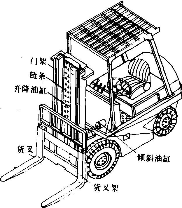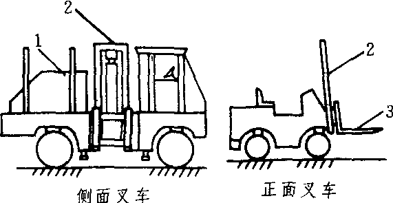 图2 部分自由提升的叉车起升过程示意图 特性 叉车具有一般工程车辆的各种性能,对其各种工况的稳定性要求更为严格。中国标准GB5141—85(等同ISO1074—1975)规定了叉车在水平地面满载堆垛和满载运行时的纵向稳定性指标,以及在满载堆垛和空载运行时横向稳定性指标。在不能满足上述稳定性指标的情况下,通常采用改变叉车自重重心位置及重量来调整。重心越低,有利于提高叉车的纵向和横向稳定性;重心越靠后方,纵向稳定性越高,但横向稳定性差。只有确定合理的重心位置,才能全面地满足上述四种状态的稳定性要求,保证叉车安全作业。 趋势 随着国民经济的发展,叉车的使用范围将进一步扩大。在中国,中小型内燃叉车的生产发展较快,而蓄电池叉车性能的改进有赖于牵引蓄电池、控制电器和低速大扭矩电机等基础件性能的提高。叉车技术发展趋势:❶重视人体工效学研究,发展叉车适用的动力机等部件,减少排气污染和降低噪声,提高操作舒适性和安全性; ❷应用电子控制技术,增加叉车功能,如叉车自动称重和货叉自动对位,减少能源消耗,如势能回收和变矩器电子控制调节; ❸叉车作业应用计算机控制,充分发挥叉车效能。 叉车forklifttruck在汽车或特种车辆底盘上装有货叉和门架等工作机构的装卸搬运机械。采用液力机械传动居多,由动力装置、车架、工作机构、行走机构和转向机构等组成。按货叉的安装位置分正面叉车和侧面叉车。正面叉车的货叉位于叉车前轮的前方,这类叉车型式较多,以平衡重叉车为主,其车架后面装有平衡重,以保持满载时的稳定性。货叉依靠液压油缸升降,门架倾斜和行走机构运动铲运短件货物。它机动灵活,装卸效率高。侧面叉车的货叉位于叉车前进方向的侧面,其货叉除升降和倾斜外,还可以沿车身侧面伸缩,将铲装的长件货物放在车架的货台上,并作短距离运输。它没有正面叉车机动灵活,装卸效率低。叉车适用工矿企业、车站、码头和贮木场等部门。
