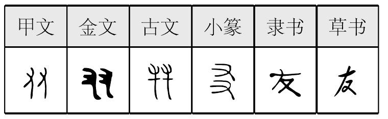 《説文》: “友, 同志爲友。 从二又。 相交友也。, 古文友。 , 亦古文友。”