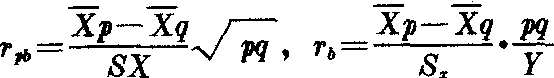 在双列变量中有一列为连续变量,而另一列为“二分”变量(如男生与女生、合格与不合格、三好学生与非三好学生等)或可人为地分成“二分”变量。此时可用下式计算这双列变量的相关: