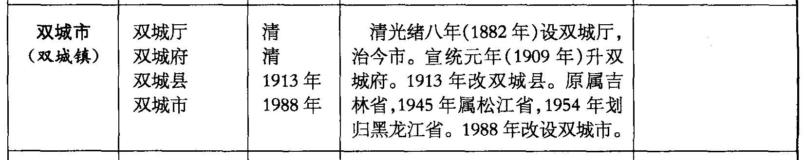 双城市(双城镇)双城厅双城府双城县双城市清清1913年1988年清光绪八年(1882年)设双城厅,治今市。宣统元年(1909年)升双城府。1913年改双城县。原属吉林省,1945年属松江省,1954年划归黑龙江省。1988年改设双城市。