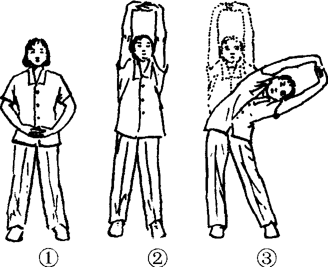 练功十八法第2套第1节。动作过程:两腿分立,略宽于肩,手指交叉于腹前,掌心向上。(图2—4—127—❶)❶两臂上提至脸前翻掌上托,掌心向上,抬头挺胸。(图2—4—127—❷)❷两臂带动上体向左侧屈一次。(图2—4—127—❸)❸再侧屈1次。❹两臂经体侧下落还原。❺~❽动作与❶~❹相同,但方向相反。共做2~4个8拍。注意事项:反掌上托时,上体正直,手臂伸直;体侧屈时,髋关节不要移动。此功法对腰僵直,脊柱活动不便侧弯有一定疗效。