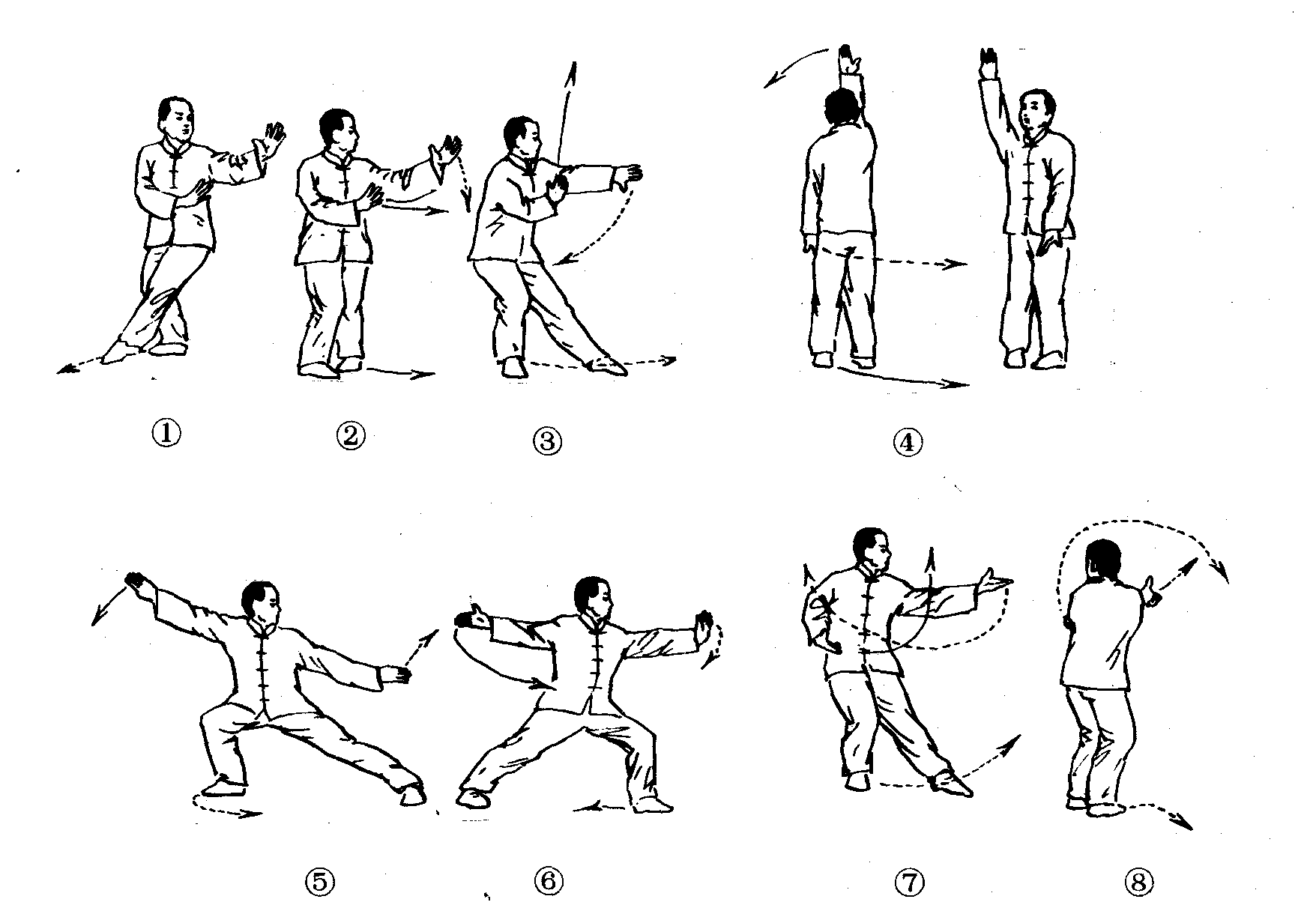 ❽青龙探爪:上体向右转,右脚向前上半步,同时右臂内旋,经上向右划弧撑掌,左臂向内旋,向右肋下推掌,成右势青龙探爪。动作要领:“鹞子钻天”和“燕子抄水”的动作要协调连贯,身体重心的移动要明显。注意事项:老年初学者要特别注意“鹞子钻天”转身撤左腿时,要以右腿支撑身体重心,并以右脚跟为轴。