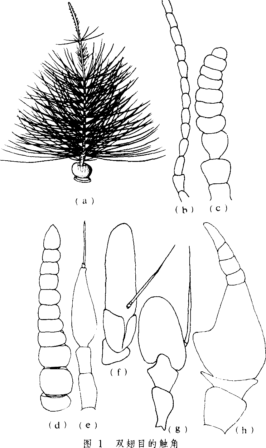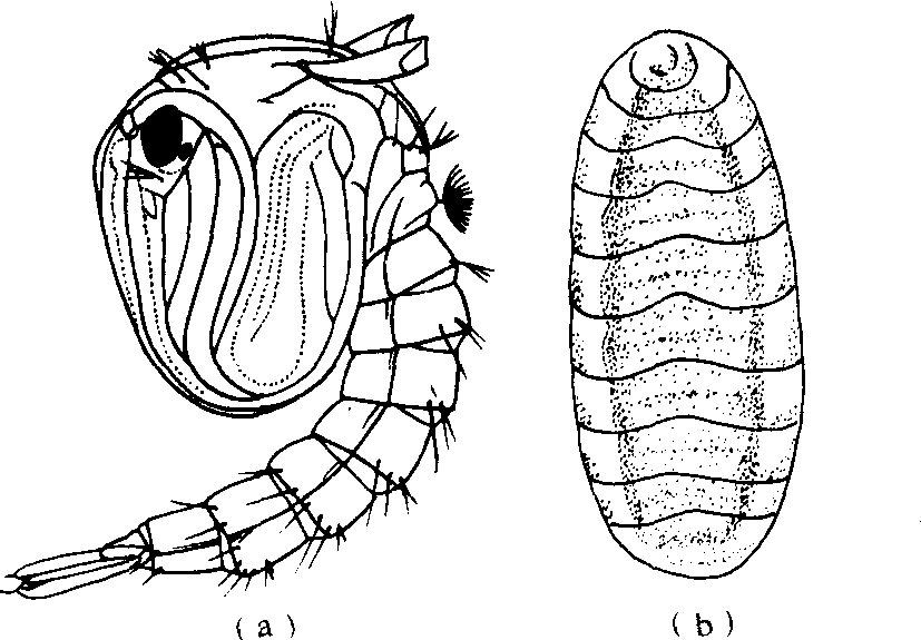 复眼发达,单眼2~3个或缺如; 口器舐吸式或刺吸式,上颚很少存在,下唇端部常膨大成唇瓣。前、后胸退化,中胸特别发达,具翅一对,膜质,极善飞翔,后翅退化成平衡棒,极少种类翅退化或缺如; 翅脉常有消失或合并现象; 在食蚜蝇科中,R4+5 脉与M1+2脉间有一条褶皱状或骨化的伪脉,为识别此科的主要特征。足3对,短或很长,跗节5节,爪及爪垫各一对,一般有一个爪间突。腹部分节明显,蚊类中一般分为11节,蝇类中仅能够见到4或5节,末端数节形成尾器。在雄性长角亚目中第九或第九、十腹节有抱器,在环裂亚目中则有肛尾叶(即尾须)和侧尾叶(surstyli),合称尾叶,交配时起抱握作用; 雄性交配器主要为阳体及阳基侧突; 雌性蚊类一般第九、十节缩入体内不易见,蝇类中第六至八节形成产卵管,节间膜极发达,能伸缩套叠,静止时隐藏腹内不外露。 习性 大都两性生殖,卵生,某些环裂亚目伪胎生和胎生,前者卵期在雌性体内发育成熟,产下的卵立即孵化,后者如蛹蝇类,其雌体产下的为前蛹期幼虫,不取食即化蛹;此外也有少数种类进行孤雌生殖(在毛蠓科及摇蚊科中可见)及幼体生殖(某些瘿蚊科的种类)。卵一般单产或成块堆在食物上、食物中或产于幼虫栖息场所,也有产卵在水下、土中,植物的组织内部或活的寄主体内、体表。卵长卵圆形或纺锤形,卵壳表面平滑或常具细微刻纹。幼虫俗称“蛆”,无真正分节的足,体分节,头有或无,口器不显著,眼常缺如。通常有3种类型(图2):❶全头型:头部发达、完整,如蚊类幼虫; ❷半头型:头的后部及口器或多或少退化、不完整,部分缩入胸部,如虻类幼虫; ❸无头型:头部不明显,口器退化,仅有1~2个口钩,如蝇蛆。大部分长角亚目幼虫分4龄 (蚋科Simuliidae6龄)、短角亚目5~8龄、环裂亚目3龄。蛹一般有两种类型(图3 ):❶裸蛹。全身裸出或称自由蛹; ❷围蛹。全身完全被包在由末龄幼虫体壁硬化而成的桶状蛹壳中。成虫羽化有两种方式:❶直裂。成虫羽化时由蛹背呈“T”形裂开,如蚊和虻; ❷环裂。成虫羽化时由蛹的前端呈环状裂开,如蝇类。
