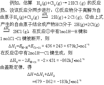由键焓(平均键能) 的定义得知,对于反应物和产物均为气态物质的化学反应来说,可根据反应物分子的总键焓与产物分子的总键焓之差值来估算反应热,即