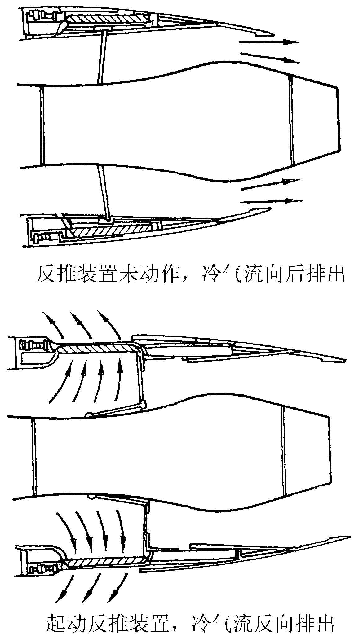 改变发动机推力方向的装置。将涡轮后膨胀的一部分(或全部分)燃气流或风扇出口的空气流转折一定角度,斜向前方喷出,产生与飞机飞行方向相反的推力,用以缩短飞机着陆时的滑跑距离。典型的高涵道比涡轮风扇发动机依靠使风扇排出的冷气流反向排出的方法获得反推力(见下图)。对于内涵排出的燃气流一般不安装反推装置。
