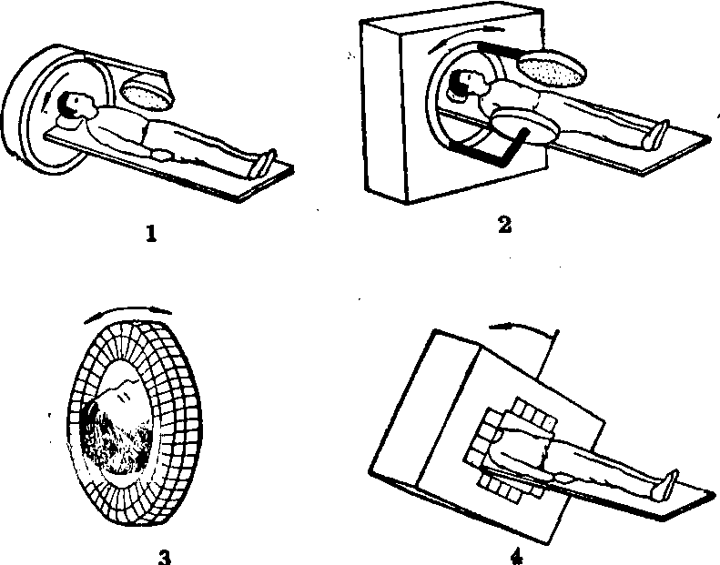 对16个象素单元,需要16个方程才能解出每个单元的放射性活度,而图象重建就是求出活度分布图。实际工作中,16个单元是不够的。又由于距离、吸收、散射等的不同,每个单元在各“投影”面上的探测效率也不相等,各自需要一个修正系数。所以计数过程复杂而冗长,只有用计算机才能完成良好的重建工作。 以上是一个断层中核素分布图的重建原理。计算机还能根据预先编制的程序将许多连续的断层分布重建图综合成一幅立体分布图。根据需要,随时可从计算机的内存中抽取任一断层重建图,供诊断、研究用。 仪器的基本结构 发射计算机断层仪正处在发展过程,现有的仪器有多种不同的结构。 SPECT机中,最简单的一种实际上就是可旋转360°的γ照相机。探头每旋转一定角度就同时对几个断层面进行“投影”摄象,旋转一周完成整个断层过程。仪器通常可兼作普通γ照相机用。缺点是完成一次断层的时间较长(15~30分),不适宜作快速动态检查;而且每一方位仅作一次“投影”,要求受检区有较高的放射性活度才能满足统计学上的要求,故灵敏度较低。 对上述仪器的一种改进是采用两个相对的大视野γ照相机,围绕受检者作同步旋转。整个探头只需转180°即可完成断层过程,时间有一定缩短,灵敏度也有适当提高。 另一类改进的SPECT机是采用一圈或数圈多晶体探测器,受检者处于圈的中央,以代替单探头γ照相机,每圈探测器可排列成圆环状,也可排列成正方形或三角形的环。进行断层摄影时,位于不同方位的探测器同时摄取“投影”,亦即每一方位都有多次“投影”。所以灵敏度较高,所需时间也进一步缩短。为了避免固定的多孔准直器造成“投影”死角,整个探头仍需有一定的旋转运动。有的仪器以小角度的来回摆动式旋转代替大角度的旋转,还有的仪器采用特制的铅屏蔽环,环上有几条随机排列的狭缝,以使屏蔽环旋转来达到消除死角的目的。 图4是几种类型的SPECT机示意图。