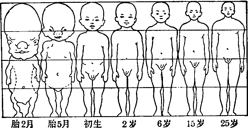 胎儿到成人身体发育比例 第二性征年龄 是用第二性征发育指标所制成的标准年龄,来反映个体儿童的发育状况。最常用的性征发育指标女孩有乳房、阴毛、腋毛、骨盆宽和女性体态等,男孩则有腋毛、阴毛、喉结、变声、胡须、肩宽和男性体态等。可按各性征指标从开始发育到完全成熟之间不同的发育程度划分成不同的发育阶段,分别代表不同的发育水平(见“女性及男性性发育”条)。有人还采用性征指数的方法以综合评价第二性征的发育状况。办法是,对男女孩的阴毛、腋毛以及女孩的乳房发育这类指标,按其发育阶段打分(如对乳房发育的Ⅰ、Ⅱ、Ⅲ、Ⅳ、Ⅴ度分别打上0、1、2、3、4分); 对男孩的胡须、变声、喉结等则分别按有无计0分或1分,然后累计总分,进行评价。在选择指标时需注意其代表性,男女孩完全成熟时的总分也应一致。这种综合指标有利于和其它发育指标作比较和进行多元回归分析,也有助于对青春期发育的进程进行较全面的评价。 性征年龄评定法的使用只限于青春期(一般为10~20岁阶段),个别早熟女孩的乳房发育可早至8岁。 牙齿年龄 简称齿龄,是按儿童牙齿发育顺序所制定的标准年龄,用以反映个体儿童的发育 (尤其是骨胳发育)状况。其评定方法有二:一种是用儿童牙齿萌出的数量和质量来表达发育年龄; 另一种是用X线摄片的方法进行观察,可包括从第一个牙齿开始钙化到最后一个钙化完成的全部发育过程。乳齿与恒齿的发育程序如下表: 牙齿发育程序表