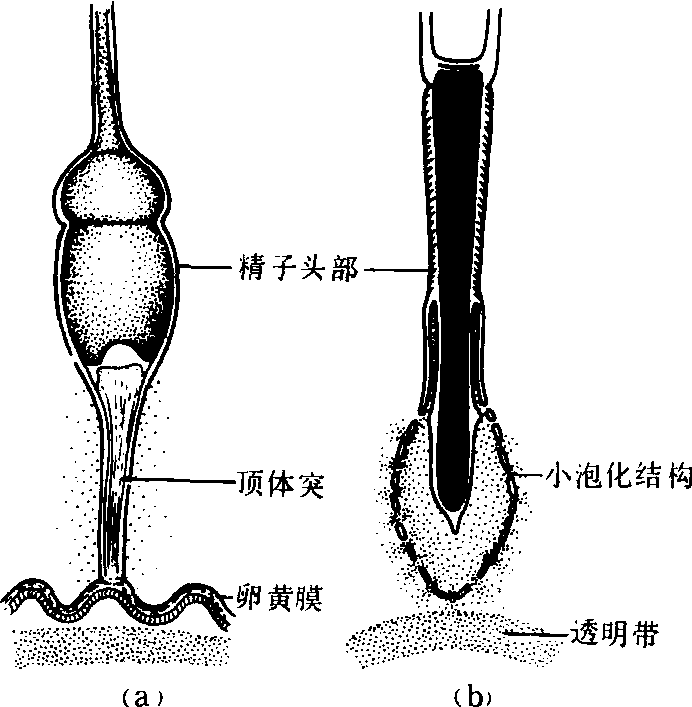 精子穿过卵黄膜或透明带 顶体继续释放出另一种酶称顶体素,能将卵黄膜或透明带溶解,以便精子顺利通过,随即与卵子表面的微绒毛相接触,这时精子的活动能力逐渐减弱以至消失。 精子质膜与卵子质膜相融合 首先,精子头的中部和后部质膜与卵子微绒毛质膜平行相贴(大鼠),然后相互融合,形成一连续的膜,并逐渐包围整个精子头部,两者质膜继续向精子尾部融合,于是整个裸露的精子被“拖入”卵内(中国田鼠和野鼷鼠的尾部脱落在外)(图2)。 受精反应 一旦精、卵质膜相融合,卵子即被激活,其内部发生一系列受精反应的变化:❶皮质反应。表现为皮质颗粒膜和卵子质膜相融合,并释放出皮质颗粒内的酶。 ❷透明带反应。即皮质颗粒内的酶破坏透明带上精子受体的反应,其意义在于阻止其他精子入卵而实现单精子受精。 ❸卵黄膜反应。与透明带反应一样,同样能阻止多精子入卵,这由皮质颗粒膜加入卵子质膜内而使后者发生膜的变性所引起;在海胆,这时的卵黄膜已变为硬性的受精膜。 ❹雌、雄原核的形成与发育。许多动物(海胆、文昌鱼和蛙等)的精子入卵后旋转180°,但有的不旋转(小鼠和大鼠); 入卵后的精核受卵细胞质内雄原核生长因子的作用开始膨胀,转变为雄原核;卵核在完成两次成熟分裂后,转变为雌原核。雌、雄原核不断生长,核内DNA复制,通常雄原核生长较快,体积较大,随着生长,两原核向合子中央靠拢。 ❺原核联合或原核融合。两原核靠拢后,核膜破裂,两原核染色质变为染色体,互相混合排列在赤道面上,此为原核联合,如蛔虫、海滨蛤等; 两原核靠拢后,核膜互相融合,共同组成合子核膜,内含松散的雌雄性染色质,此为原核融合,如海胆; 受精到此结束(图2)。