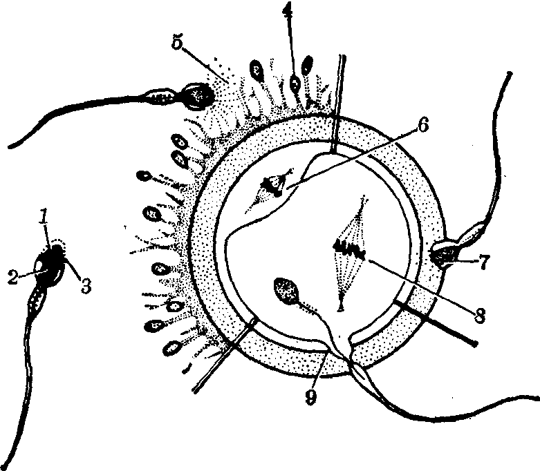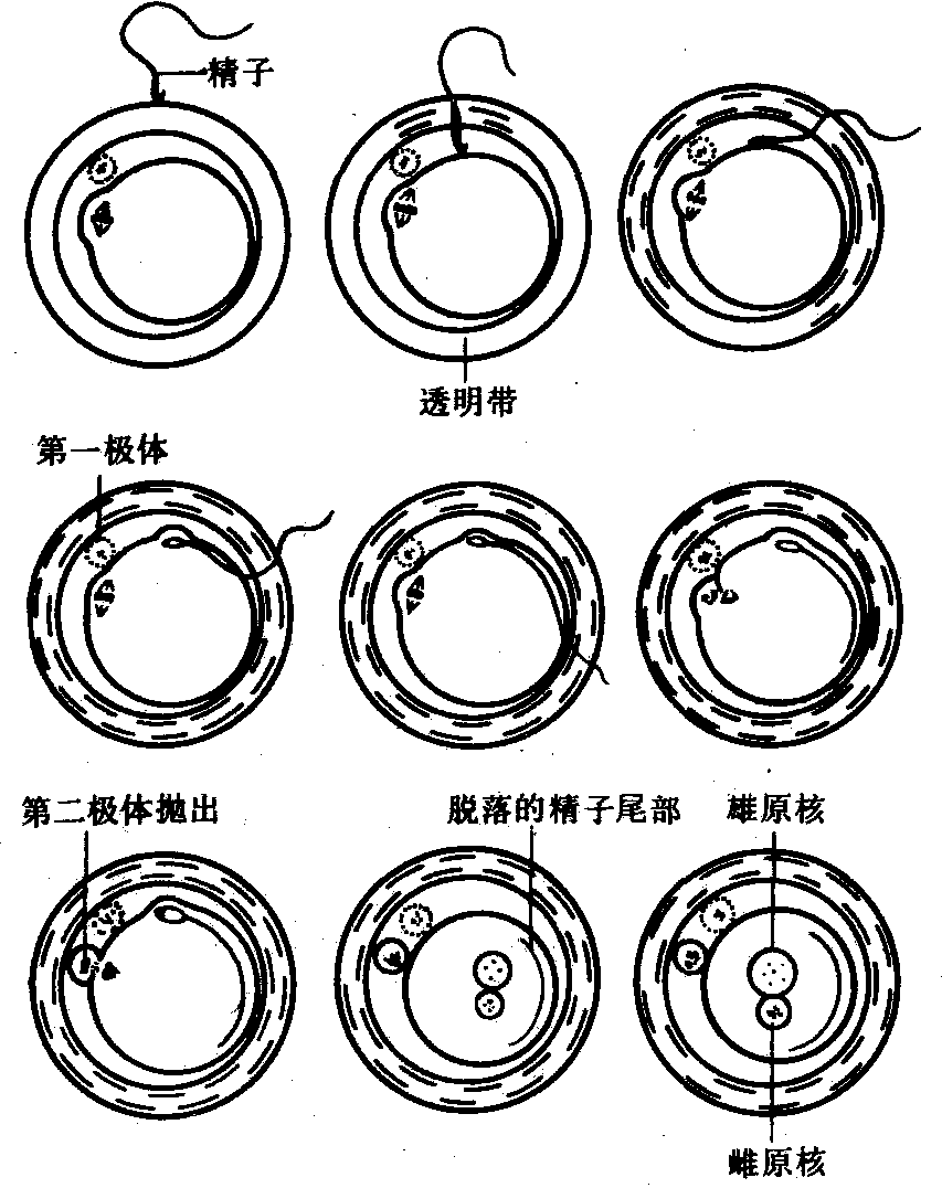 图1 精卵接触时的变化 1.顶体 2.精子细胞核 3.质膜 4.放射冠细胞 5.顶体释放内容物 6.极体分裂 7.内顶体膜溶解 8.次级卵母细胞第二次成熟分裂 9.卵母细胞与精细胞膜融合 精、卵接触前后的变化 卵子刚从卵巢排出时外面包有透明带和放射冠(图1),进入输卵管后,放射冠在输卵管液碳酸酐酶的作用下开始松散,遇到精液和精子头部顶体含有的透明质酸酶后,便完全分散或被穿透。借助于这二种酶与放射冠细胞中所含的透明质酸和透明带中的粘多糖等物质的特异性反应,使精子能顺利地粘附在卵膜上。精子顶体中另一种酶(类胰蛋白酶)则能使精子穿过透明带。在人卵的体外受精过程中可观察到整个透明带粘满精子,精头埋入透明带内而精尾则留在外面作剧烈的同步摆动。一旦精头与卵黄膜接触后,即引起卵质和膜反应而将整个精子吸入卵质内。兔卵则在精子进入卵质突出处形成受精锥,接着受精锥回缩,一起将精子吸入卵内。