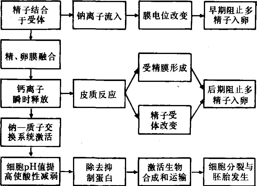 图 2 大鼠受精过程示意图 受精过程的生化变化 在海胆上已有广泛研究。精子入卵后3秒,海水中的钠离子进入卵内,引起瞬时膜电位的变化,这是早期阻止多精子入卵现象。8秒钟后,细胞内的游离钙离子释放。到20秒钟,钙离子浓度大大增加,引起皮质反应,发生晚期阻止多精子入卵的现象。这时受精卵立即排出氢离子,一直延续到精子入卵后的4分钟,使细胞内pH值由6.6升高为7.2。同时,又有同等数量的钠离子从海水进入卵内,钠一质子交换后,受精卵酸度下降,可能促使结合在功能蛋白(结构蛋白)上的抑制蛋白解离,由此激活生物合成而促进胚胎发育(图3)。