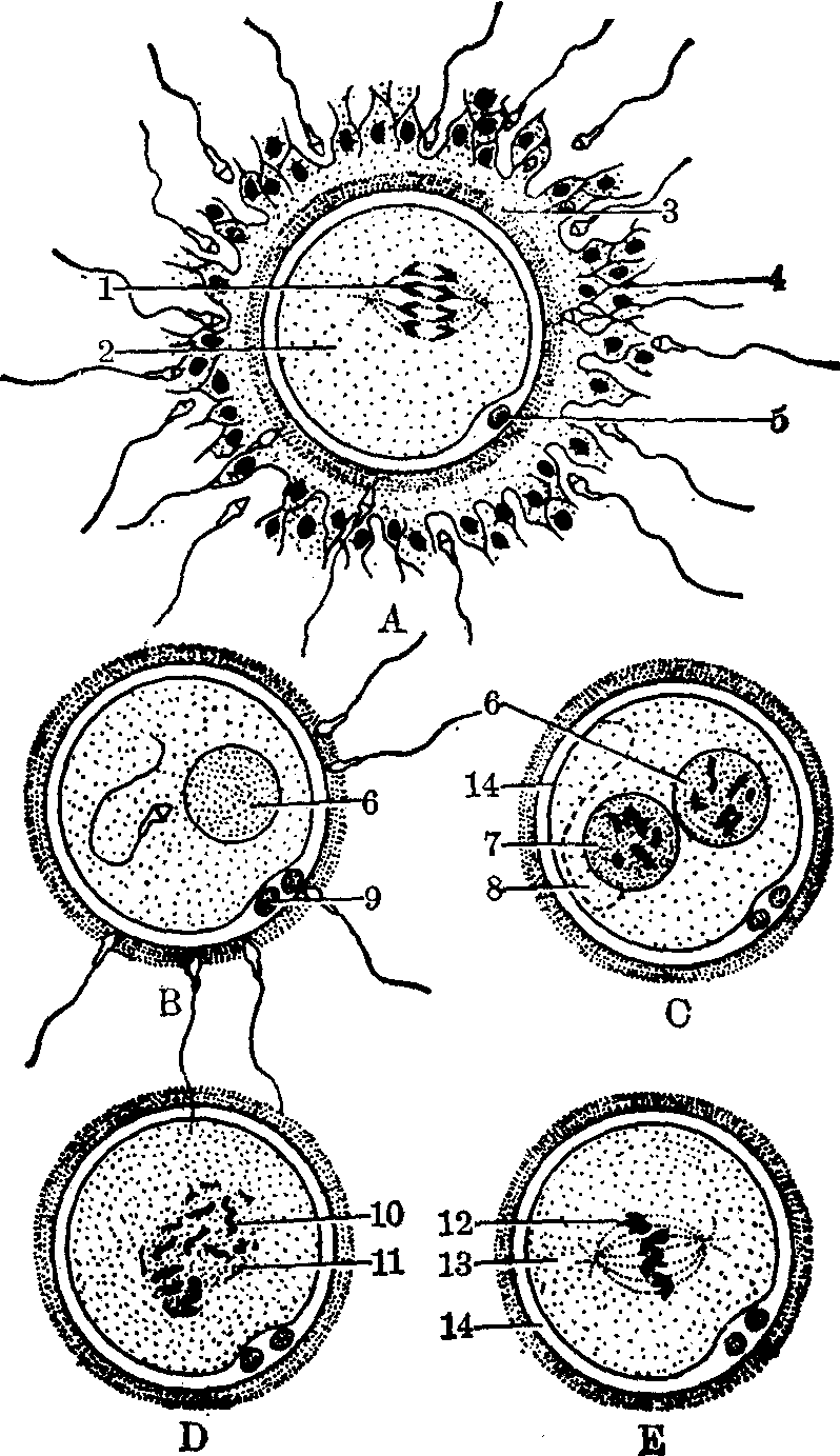 图2 受精过程图 1.第二次成熟分裂的纺缍体 2.次级卵母细胞 3.透明带 4.放射冠 5.第一极体 6.雌性原核 7.雄性原核 8.退化的精子尾 9.第二极体 10.染色体 11.原核融合 12.有丝分裂纺缍体 13.合子 14.卵周腔 精子入卵引起的带反应、皮质反应及受精膜的形成第一个精子进入卵内以后,透明带的通透性立即下降,变为具有抗拒精子溶素的能力,借以防止过多精子的进入,这一过程称为带反应。这种反应的速度在各种动物中各有不同,人、狗、羊和金黄地鼠的带反应较快,能有效地防止其他精子进入;大鼠、小鼠、豚鼠、猫和雪貂等的带反应比较慢,因而多精受精现象较普遍。透明带的这种反应据说与卵皮质颗粒释放的物质有关。海胆卵在精子进入处的皮质颗粒最先溶解,再从该处作波浪式扩散至整个卵皮质,此过程称为皮质反应,皮质颗粒的溶解物与卵黄膜融合,形成受精膜,同时,引起卵质收缩,排出液体,卵质表面形成透明膜层,在受精膜与透明膜层之间出现卵周腔,可见受精卵在其中作旋转运动。受精膜和卵周腔均有防止多精受精的作用。金黄地鼠卵皮质颗粒在精头接触时也出现溶解和沿卵黄膜扩散现象。人卵体外受精过程中也可见在透明带与卵黄膜之间形成充满液体的卵周腔(图2)。受精卵在其中作顺时针方向的旋转运动。 精子头部膨大及卵第二次成熟分裂 精子入卵后,精头即与尾部分离并作180°的旋转,吸取卵细胞质中物质,分解为许多核仁粒和染色质粒,逐渐膨大趋向于形成原核。此时卵细胞质由于皮质溶解、排水和一系列生理和代谢上的急剧变化,激动了分裂纺锤体的活动而完成了第二次成熟分裂,将第二极体排放至卵周腔(图1、图2)。用缩时显微电影记录兔卵体外受精的过程,显示精子与卵子遇合和穿过透明带的时间约为3小时; 入卵后至完成第二次成熟分裂的时间为2~5小时。 原核形成 精子头部在吸收卵细胞质和逐渐膨大过程中,染色质粒融合液化,边缘区出现活跃的蛋白质合成,最后形成为泡囊状的雄性原核。精子中段也解离,产生精星体,其线粒体及高尔基物质则散布于卵细胞质中,参与胞质配合。卵子在完成第二次成熟分裂后,分裂末期的一组染色体重组形成卵核,此时也增大形成为雌性原核,大小与雄核相等(人受精卵原核期的相差显微镜照片见图3)。电影记录兔受精卵二原核约在精子入卵后4~9小时内出现。