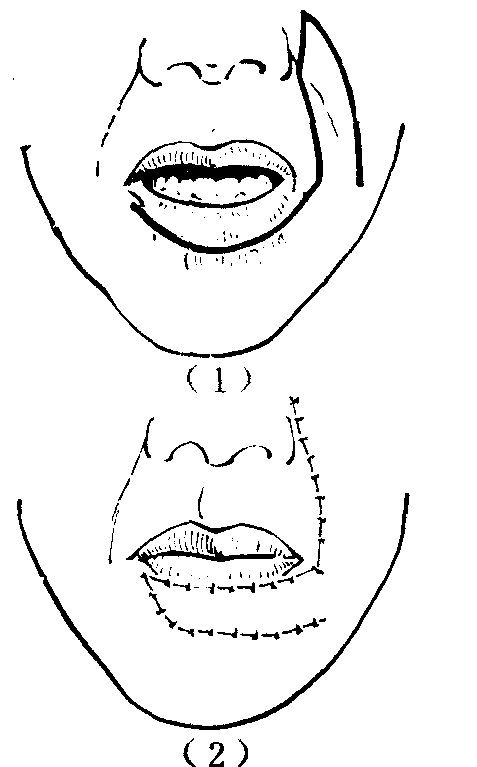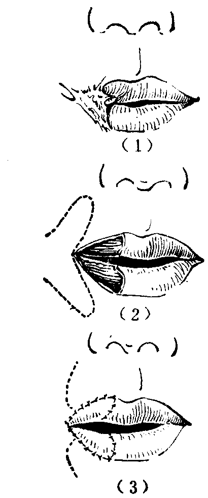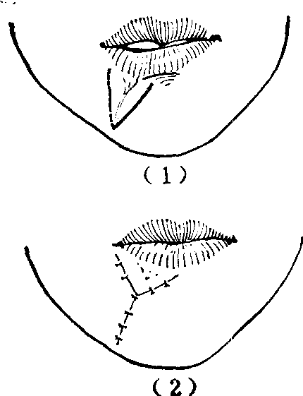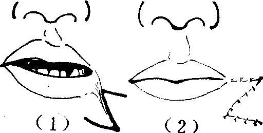 图4 颊部粘膜瓣移转矫治小口畸形 唇外翻 局限性外伤瘢痕愈合后所形成的局部口唇轻度外翻,比较少见,一般只表现为红唇缘的局部凸出不齐,口裂不能紧闭,外翻部呈切迹状缺裂。这种外翻可酌情采用单一或连串Z成形术(图5),或V-Y手术(图6)矫正修复。