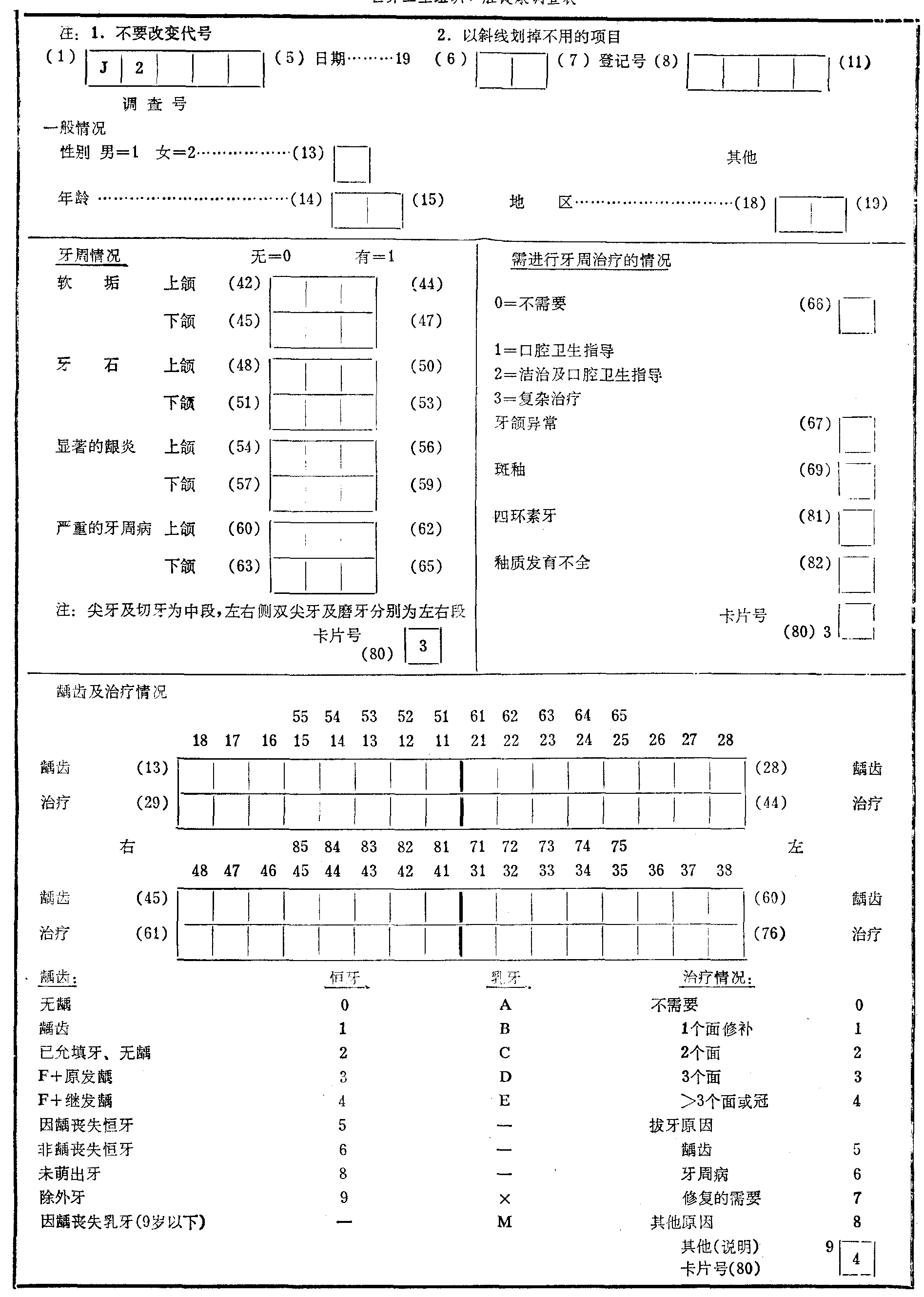 现以附表为例,说明牙周病及龋病的调查方法(表)。牙周情况: 将口腔分为六个区域,两侧尖牙之间为前牙区,第一双尖牙或第一乳磨牙至最后牙为左右侧后牙区。无软垢或牙石记为0,有则记为1。凡牙龈乳头或龈边缘有颜色的明显改变,或触诊引起出血则被认为有显著的龈炎。严重的牙周病则必需具备以下表现: 牙齿明显松动;牙周袋深度超过3mm,并至少伴有下列改变之一: ❶显著的龈炎; ❷牙龈外形明显改变; ❸牙龈萎缩、牙根暴露; ❹牙周袋溢脓。以上均以最重的情况记录,阳性者记为1,阴性记为0。 世界卫生组织口腔健康调查表