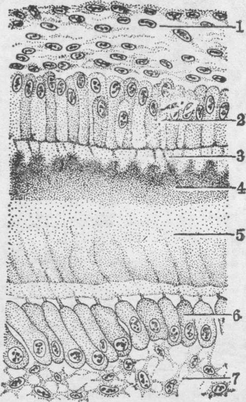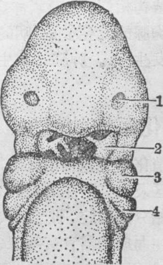 图1 口咽膜(第24~25天,2.5mm) 1.嗅窝 2.口咽膜 3.下颌突 4.第2鳃弓 口腔顶板(腭)的发生 7周时,原始口腔与原始鼻腔(嗅窝的腔隙)相通。8周末期,左、右上颌突内表面长出一对板状突起,称为外侧腭突。左、右外侧腭突呈水平方向,互相在原始口腔中线合拢,形成为口腔顶板的腭的大部,将原始口腔和原始鼻腔分隔成口腔和鼻腔(图2)。腭前部以后骨化成为硬腭,腭后部不骨化,形成为软腭。左、右软腭的后端合并处膨大形成悬雍垂。 唇与齿龈的发生 原始口腔边缘的上、下颌在7周时各出现一条外胚层增生而成的唇板,8周时它下凹形成唇沟,将原始颌分为二部,在外方的称为唇,内方的部分成为齿龈,为牙齿发生的地区。 牙的发生 牙由两个胚层分化而来,牙釉质来自外胚层,牙齿质、牙骨质和牙髓则来自中胚层。人胚第7周时,口腔已具雏形。上、下颌的上皮沿着口凹边缘形成一弓状增厚部的唇板,唇板的上皮增生,并向深部的中胚层陷入形成唇沟,唇沟将唇和牙龈分开。9周时,牙龈基部上皮增生,并伸入深部的间充质,形成牙板。牙板末端上皮继续增生,形成一团状结构称为牙釉器。在牙釉器下方的结缔组织形成牙乳头,在牙乳头外面的结缔组织包围牙釉器和牙乳头形成牙囊,牙釉器、牙乳头、牙囊三者合称牙胚。 牙釉器最初呈蕾状,是一团密集的上皮细胞,体积较小,以后形成帽状和钟状。帽状的牙釉器结构包括最外一层扁平细胞,称为外釉上皮,最内为一层柱状细胞,称内釉上皮。在内、外釉上皮之间的细胞呈星状,有突起,突起相互连接成网,网眼间充满粘性液体,此层称星网层或称釉网(釉髓,见图3)。