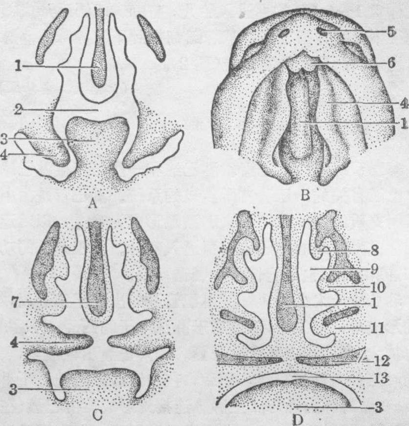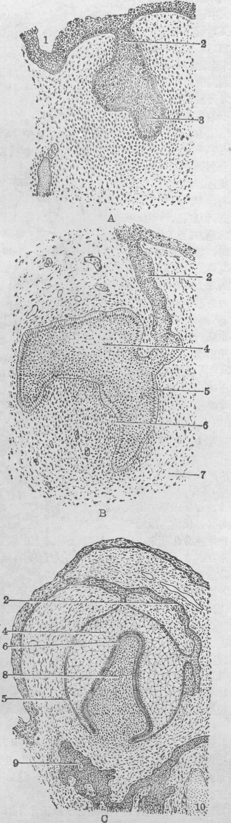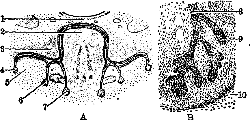 图7 唾液腺的起源与生长 A.2月人胚,经颌骨的切面 B.2月时颌下腺分支情况 1.口凹顶 2.舌 3.外侧腭突 4.腮腺 5.下颌齿龈 6.舌下腺 7.颌下腺 8.总导管 9.分支 10.被膜 ☚ 消化系统的发生 咽的发生与咽囊的演变 ☛ |