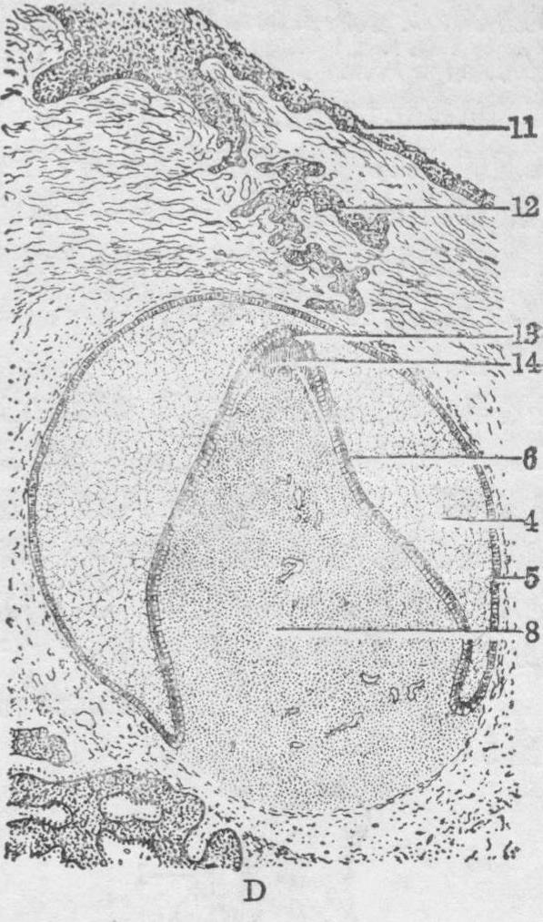 图3 牙的发生 A.蕾状期(第8周) B.帽状期(第11周)C.钟状期早期(第14周) D.钟状期(第19周) 1.唇沟 2.牙板 3.牙釉器始基 4.星网层 5.外釉上皮 6.内釉上皮 7.间充质 8.牙髓9.骨 10.软骨 11.口腔上皮 12.退化的牙板 13.釉质 14.牙质