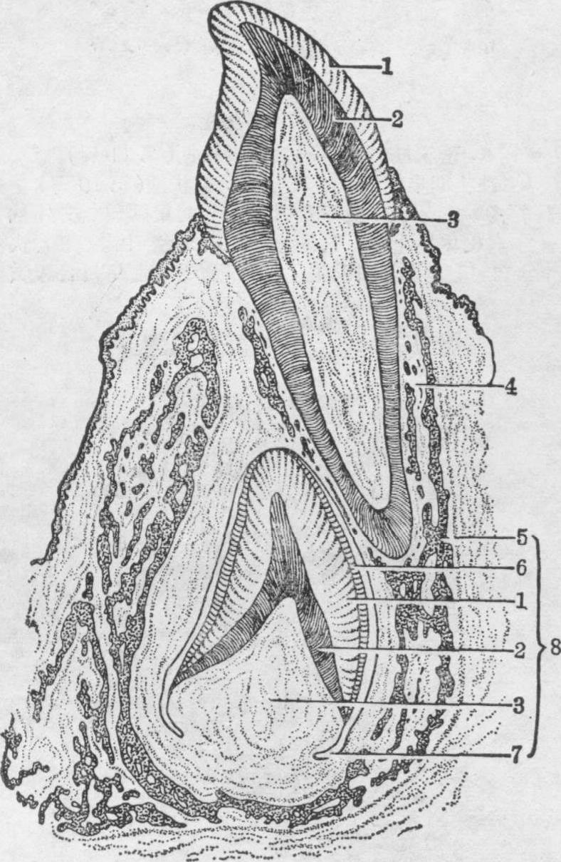 图4 釉质和牙质的形成 1.星网层 2.成釉质细胞 3.Tomes突 4釉质 5.牙质 6.成牙质细胞 7.牙髓 牙骨质的形成与牙根上皮鞘有重要关系。在牙冠形成后,牙根上皮鞘发育增生,长入间充质内而形成牙根的模式。在鞘的外侧,牙囊内层的结缔组织增生并穿过上皮鞘,使之裂分成许多片段,此时,其中的成纤维细胞沿根部牙质表面的单层立方细胞,形成牙骨质细胞层,这些细胞有分泌骨质的功能,生成的牙骨质包围于牙根牙质之外,参与牙槽骨的形成。随着牙齿的发育和颌骨的骨化,牙囊外层细胞的成骨活动,每个牙齿周围(除牙冠外),均形成齿槽骨。牙囊内一些细胞形成牙周膜,其中的纤维连贯牙骨质与齿槽骨。 人类牙齿有乳齿与恒齿之分,其构成及发生过程基本相同。人胚第10周时有20个乳齿始基,但均在出生后长出。当乳芽的牙板出现时,恒牙的牙板也随着发生,位于乳牙牙釉器的舌侧。在胚胎发育至7~8月时,恒牙的牙釉器完全形成,为将来恒牙长出作准备。待儿童6~7岁时,一部分乳牙周围组织逐渐变松,同时,由于受恒牙生长力的压迫,乳牙终于脱落,恒牙即由原牙槽中长出,代替乳牙(图5)。