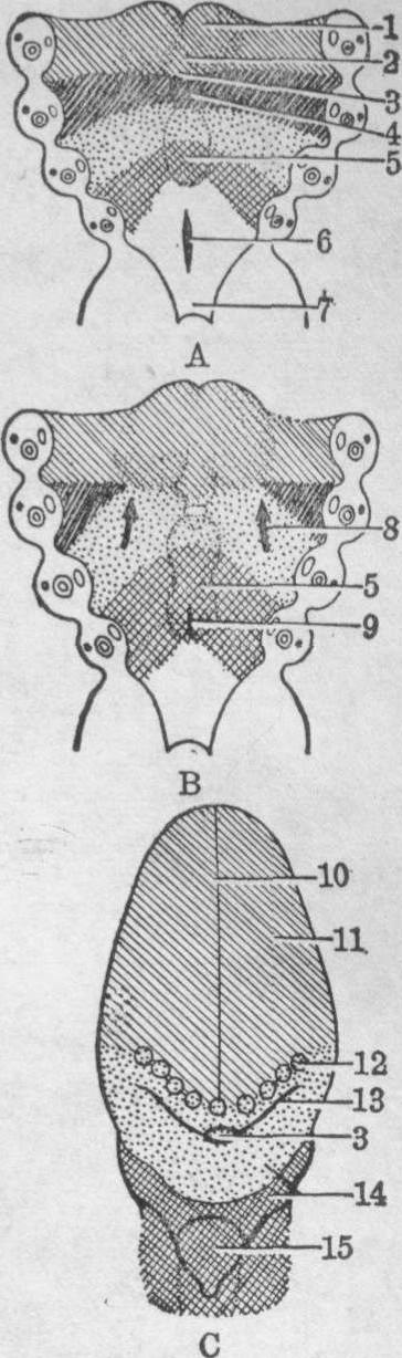 图6 舌的发生 A.第4周 B.第6周 C.成人 1.侧舌膨大 2.奇结节 3.盲孔 4.联合突 5.鳃下隆凸 6.喉气管沟 7.食管 8.第3对动脉弓中胚层移动 9.声门 10.正中沟 11.舌体 12.轮廓乳头 13.界沟 14.舌根 15.会厌 唾液腺的发生 唾液腺有三对,即腮腺、颌下腺和舌下腺。在胚胎期中出现时期各异,但均为原始口腔上皮增生分化而来。发生过程也相似,上皮细胞增生初呈条状的实心细胞索,伸生入间充质组织中,继续分支。以后产生腔隙形成导管,末端分化为腺泡。 (1)腮腺的发生: 起源于靠近上、下颌突分叉处的外胚层上皮(图7)。第6~7周时,上皮芽向深处生长,在嚼肌表面和下颌后窝处,上皮芽分成许多分支,分化为腺末房。上、下颌突会合成颊部后,腮腺导管即开口于该处颊粘膜上。腮腺导管开口的位置随个体发育而有所变化,最初开口于正在发育的上颌第1乳磨牙的对侧,在3~4岁时,即位于上颌第2乳磨牙的对侧;12岁时,位于上颌第1恒磨牙冠的对侧; 成人时,位于第2恒磨牙冠的对侧。 (2)颌下腺的发生: 颌下腺起源于颌舌沟(图7)舌下肉阜处内胚层上皮。7周时,上皮芽沿口底向后生长,在上颌角内侧和下颌舌骨肌的后缘转向腹侧,然后分成许多分支,分化成腺泡和腺管。 (3)舌下腺的发生: 舌下腺起源于颌舌沟外侧的内胚层上皮,它由10~20个分开的上皮芽发育而成。8周时,这些上皮芽向舌下区生长,形成许多小腺,并分别保留各自的导管,开口于颌下腺导管开口的外侧,但有时通入颌下腺导管而不另行开口。