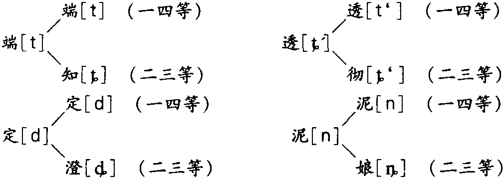 | 释义 | 古无舌上音 古无舌上音清代学者钱大昕在《十驾斋养新录·舌音类隔之说不可信》里说:“古无舌头、舌上之分,知、彻、澄、三母,以今音读之,与照、穿、床无别也,求之古音,则与端、透、定无异。”意思是上古没有舌上音“知”“彻”“澄”“娘”,不存在“舌音类隔”的问题。钱氏列举的例证有异文、反切、声训、读若等项。如“古音中如得”,《周礼·师氏》:“掌王中失之事。”“中失”即“得失”。“中”知母,“得”端母。“古音直如特”,《诗·鄘风·柏舟》:“实维我特”。韩诗作“直”。“直”澄母,“特”定母。“姪”“娣本双声字。《公羊释文》:“姪,大结反。娣,大计反。此古音也。”“姪”澄母,“娣”定母。钱氏的结论是可信的。现代厦门话里仍然舌头、舌上不分。在《切韵》《玉篇》的反切里,舌头、舌上音有了分化的趋势,端、知两组反切十分之九不混,十分之一是混切的。到唐代,知组字从端组分化出来。《开蒙要训》里端知两组注音有了严格的界限。分化的条件是:一四等字仍读舌头音,二三等字变成舌上音。就是: