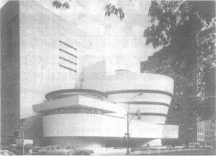 建于1960年,位于纽约市中心,主体建筑为多层螺旋形的展览廊,由顶层盘旋而下,全长约41m,围绕着玻璃顶覆盖的圆形中庭。观众可乘中庭内的观景电梯上达顶层,然后沿廊参观时不知不觉走回底层,构思独具匠心,美术馆的外观如一盘旋的螺旋体,在闹市中十分醒目,此馆建成后因其非常规的空间处理方式,曾受到一些美术馆管理专家的非议,其缓缓上升的坡地面使挂在墙上的画始终看起来是斜的,因此现在多用于陈列抽象派绘画等现代艺术作品。设计者是著名的美国建筑师赖特。