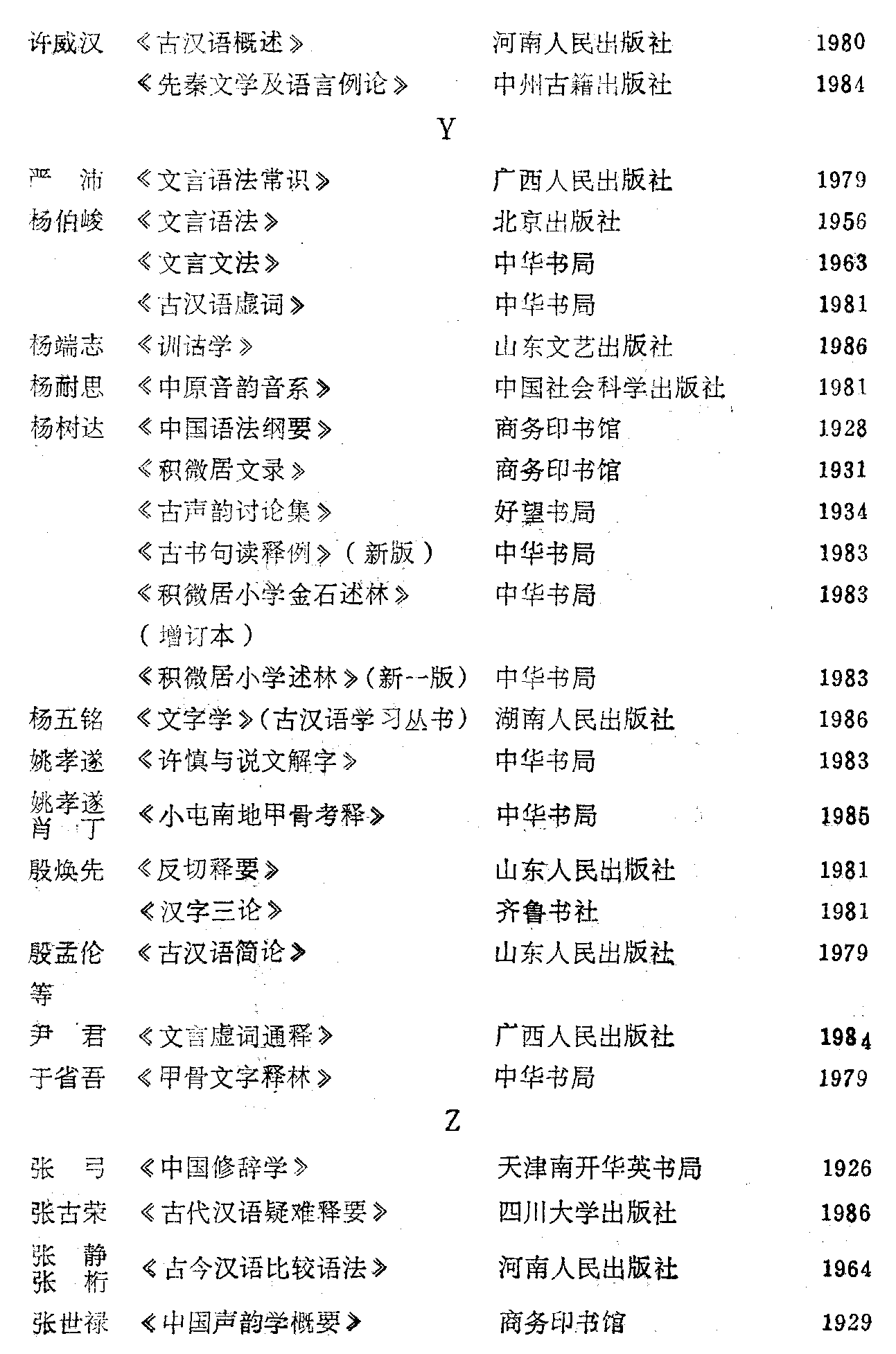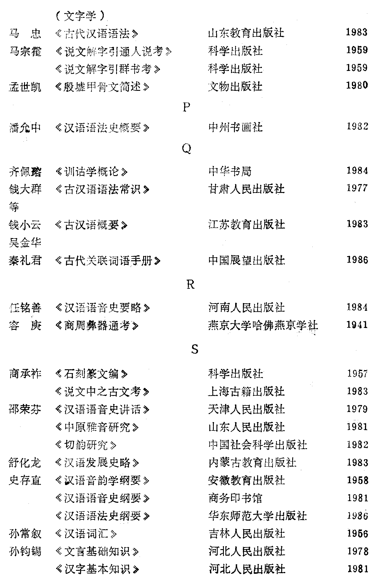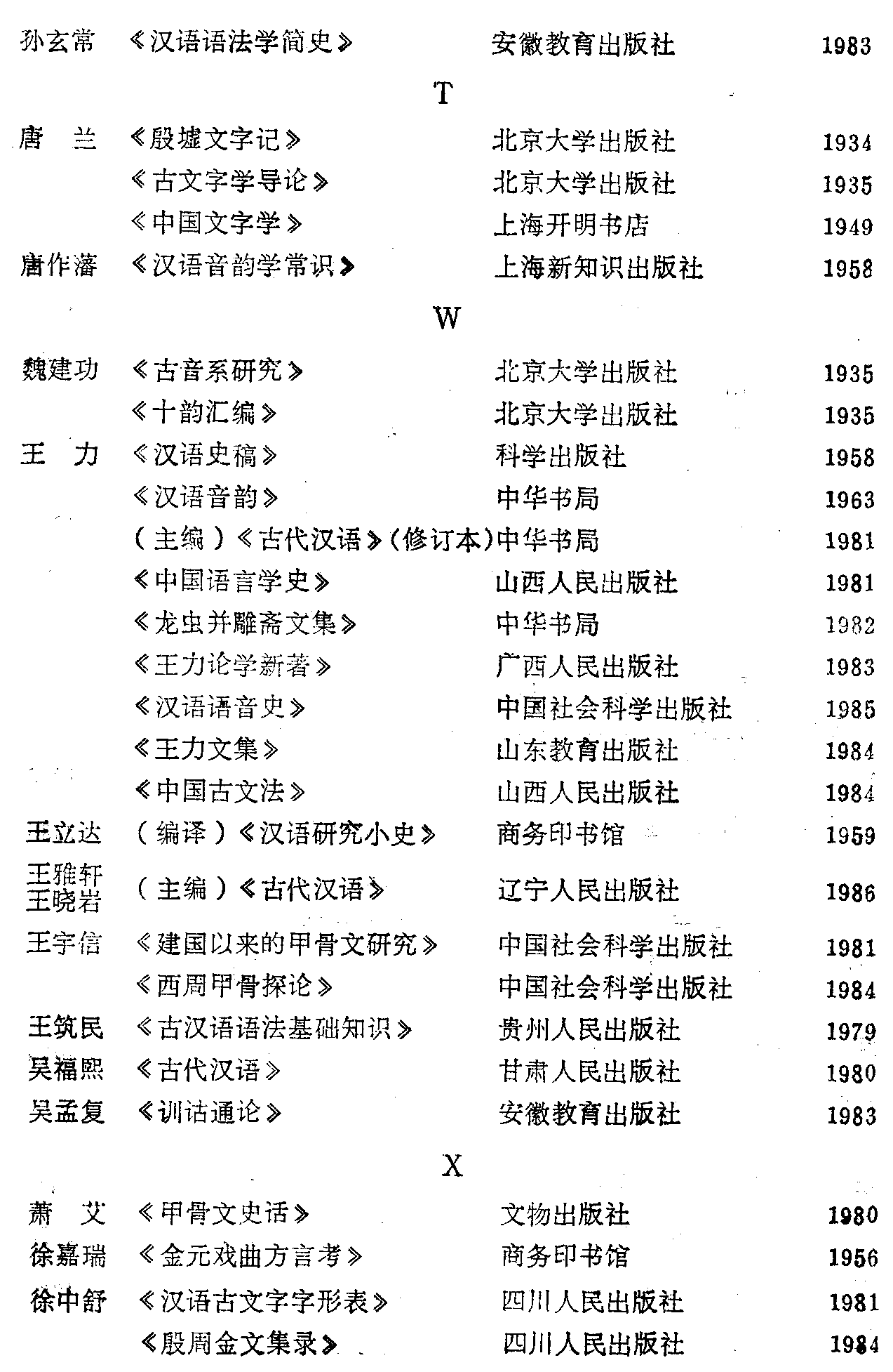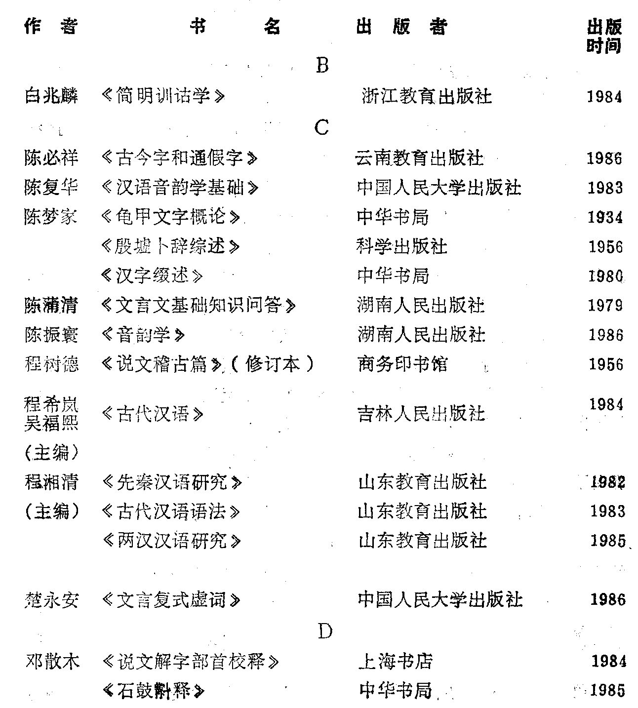 说明 1.本表收录范围,以1949年以后我国学者编撰的关于古代汉语研究方面的专著为主,由于时间、资料的限制,遗漏在所难免。 2.台湾、香港的古汉语专家、专著,因无法全面了解,故仅能就现有资料作举例性的介绍,附于表后。 3.为避免重复,对本辞典中已列入正文条目的古汉语专著及工具书,表中从略。 4.本表的编排方法,是先列个人编撰的著作,次列集体编写的著作,依作者姓氏(编写单位)的现代汉语拼音字母顺序排列。 |