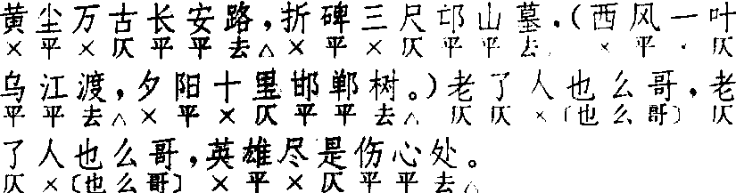 | 释义 | 叨叨令 叨叨令无名氏 小令 ![]() 全曲七句:7△,7△,7△,7△。6,6,7△。第六、七句必叠,“也么哥”是定格字,可不管文义为之,或作“也末哥”、“也波哥”。通首用去声韵,韵上二字须平平。除定格二句外,五句句式平仄完全相同。通首多作对语,或二句对,或四句对,或五句全对。《西厢记》长亭折:“见安排着车儿马儿不由人熬熬煎煎的气,有甚么心情花儿靥儿打扮得娇娇滴滴的媚,准备着被儿枕儿则索昏昏沉沉的睡,从今后衫儿袖儿都揾做重重叠叠的泪。兀的不闷杀人也么哥!兀的不闷杀人也么哥! 久已后书儿信儿索与我恓恓惶惶的寄。”通首作叠字体,真有叨叨的意味,为人所喜诵。须注意者,叠字须平声。周文质有小令四首,用独木桥体,即通首用同一字叶韵。小令兼用。可连用〔折桂令〕为带过曲。 ☚ 呆骨朵 塞鸿秋 ☛ 叨叨令 叨叨令曲牌名。属北曲正宫。字数定格及韵式据清·周祥钰《九宫大成谱》作七、七、七、七、五、五、七(七句),或作八、八、八、八、六、六、七 (七句)。规定第五六句末三字必作“也么哥”或“也波哥”。从第一至第四句,其句式平仄完全相同,正如今人王力《汉语诗律学》所说:“真有叨叨的意味”。近人吴梅《南北词简谱》:“也么哥句可不管文理为之。通体皆叶去声,切勿用上声韵。”又,“也么哥”前可用叠字,叠字宜用平声。该调可用作小令,亦多用于套曲中。如元杂剧《西厢记》第二本《楔子》中惠明所唱。 ☚ 倘秀才 脱布衫 ☛ |