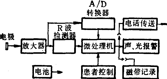 可行走病人心电监护系统有多种类型: ❶无线遥测发送一离身接收记录及回放系统; ❷直接检测记录一离身回放显示系统; ❸模拟式磁带记录器一模拟计算机快速回放系统; ❹数字式磁带记录器一数字计算机回放系统; ❺佩带式心电智能监测系统。其中,前两类不具备分析功能,回放时间长;前四类的回放分析都是回顾性的,记录与诊断之间延误时间长,连续记录的时间最长不超过26小时,因而不能满足临床要求。 佩带式心电智能监护系统由患者随身佩带,能实时检测和分析心电信号,判断心律失常信号,并在发现心律失常后能自动以声、光报警,同时启动磁带记录器进行舍取性的记录,或通过电话系统将异常心电信号传送到中心医院的计算机系统,进行处理和诊断;亦可通过佩带的监测器内的微型发射装置将突变的心电数据发送给离身的收录机,进行记录和回放分析。佩带式心电智能监护装置的方框图如图2所示。这种系统的磁带利用率很高,若电极贴得好,佩带和连续监测时间可长达4~7天,更能可靠地捕捉偶发性心律失常信号,提高监护功能,以适应临床的需要。