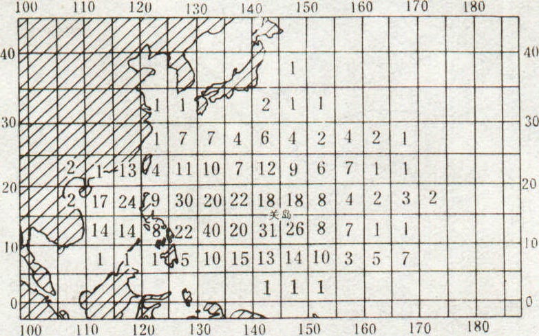 图1 各台风发生区发生台风的年平均数及其占全球台风总数的百分比 北太平洋西部各月发生台风次数和在中国登陆次数(1949~1969)