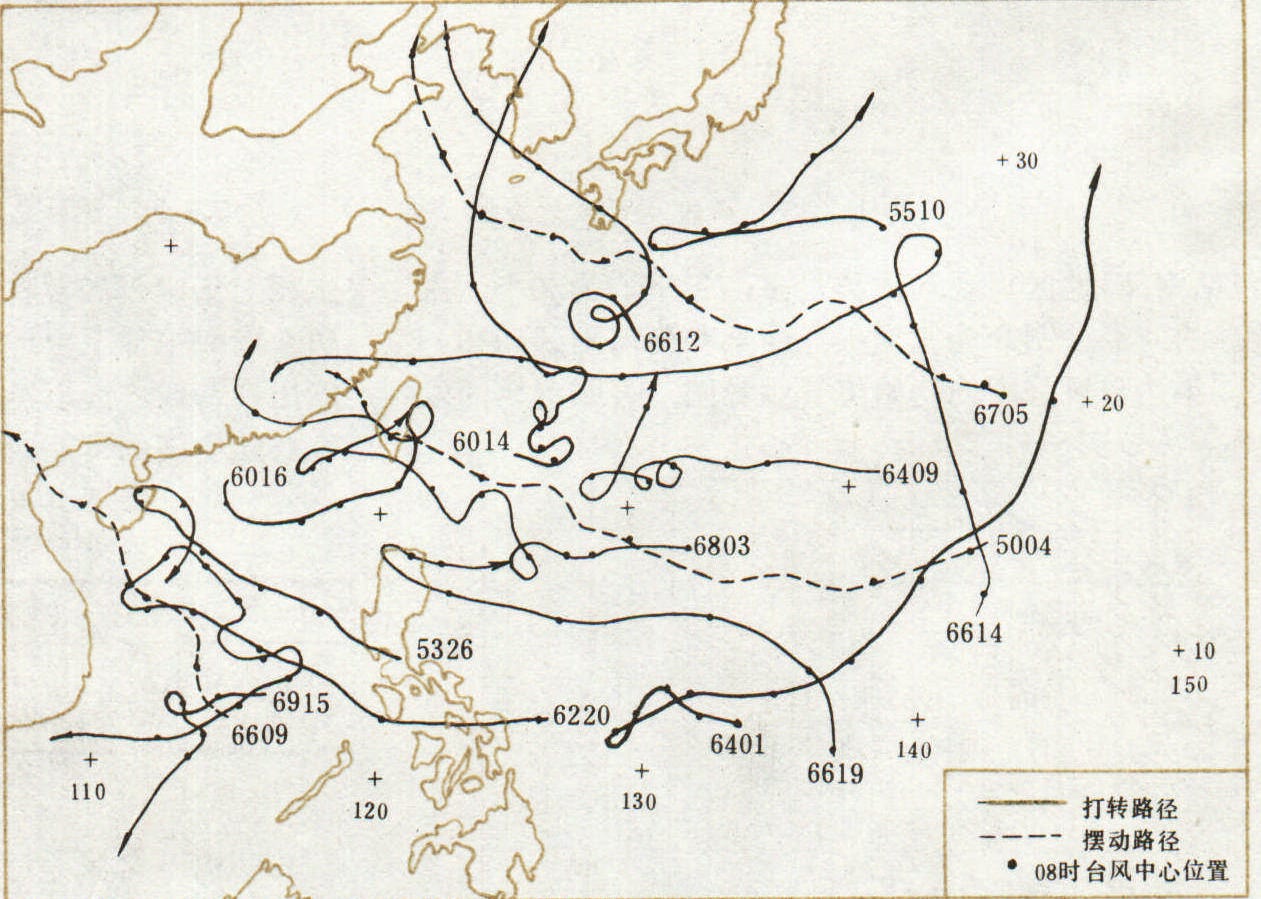 图 4 台风移动基本路径图 台风typhoon发生在热带海洋上的暖性强热带气旋。由于台风生成的地区不同,人们给予不同的名称。在东太平洋和大西洋的称飓风,在印度洋的称风暴。按国际分类标准,近中心最大风速等于或大于32.7 m/s(风力12级及以上)者称为台风。中心气压很低,一般在950 hPa左右。1970年第20号台风,达870 hPa。台风直径一般为600~1 000 km,最大的可达2 000 km以上,最小的100 km左右。台风是暖性低压,它的形成需要较高的温度和丰沛的水分,故发生于热带海洋上,被副热带高压南侧的东风气流引导西行。袭击中国的台风常发生于5~10月,以7~9月最为频繁。6月以前和9月以后主要影响南海海域及华南地区,7~9月影响东南地区及华东沿海的机会明显增多。被袭击地区常有狂风、暴雨。 台风发生在北太平洋上的风力达12级及以上的热带风暴。中心气压990~870 hPa,风速30~50 m/s有时超过80 m/s,日雨量可达1600 mm。台风直径约1000 km,每秒放出的能量相当1颗普通原子弹,其外层是云带、云墙,中心是无云的眼区。积雨云顶可达19 km,眼区半径10~70 km(平均25 km)。台风形成的4个条件:❶广阔高温洋面海温26~27℃; 台风 台风Taifeng发生在热带海洋上深厚的强烈旋转的空气涡旋。国际规定风力在12级(32.7米/秒)以上的涡旋称为台风。风力在10—11级者称强热带风暴;风力在8—9级者称热带风暴。在1989年以前,台风包括风力8级以上的所有热带涡旋。我国气象局把每年发生在150°E以西、赤道以北的台风,按出现顺序予以编号。例如9108号台风是指1991年出现在上述地区的第八个台风。