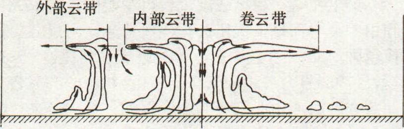 结构 台风是近似圆形的强低压,其结构大体分为三圈。最里面是台风眼,近似圆形,直径一般为八十公里,海平面气压最低,风速小,云层薄,甚至为少云晴天。台风眼的外围为台风涡旋区,距台风中心约几十到二、三百公里,最强的水平气压梯度、风速、对流、降水都出现在这个区域。再外面是台风的外围,这里常有6级以上的大风, 云雨多呈螺旋带状分布,向台风内部汇合,螺旋云带多为旺盛的对流云所组成,云带内可发生强降水。对流层中部和上部, 台风中心的气温比外围同高度的气温可以高10℃以上,是暖心结构。台风气流旋转最强的部位在对流层下层, 向上逐渐减弱,在对流层上部和平流层下部则可为反气旋,空气由下层流入, 上层流出(图3)。
