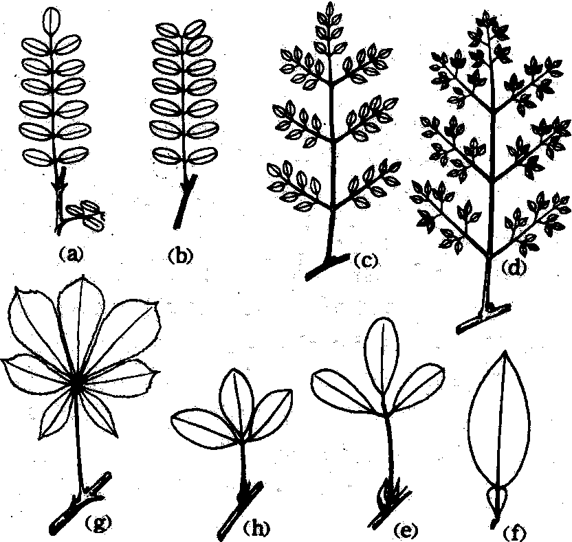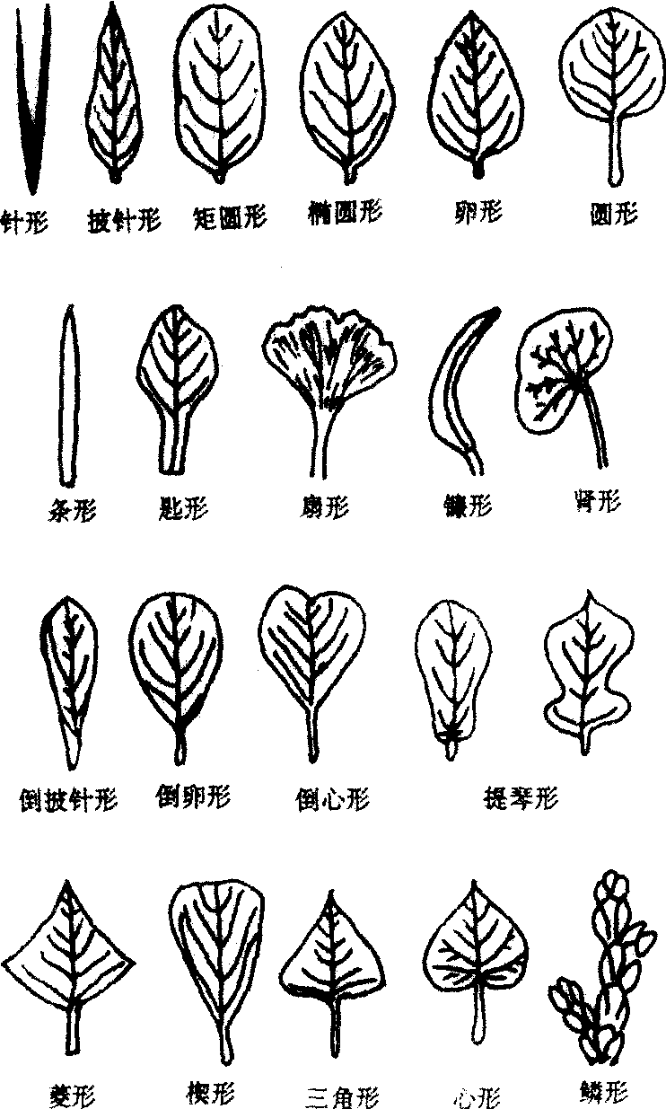 羽状复叶 小叶排列在叶轴的两侧。依据小叶的的总数为单数或双数,分为奇数羽状复叶(如槐、蔷薇)和偶数羽状复叶(如落花生、皂荚)。也可按叶轴分枝的情况进行归类,叶轴不分枝的为一回羽状复叶(如槐、落花生),叶轴2~3级分枝,小叶生于叶轴末级分枝上,分别称为二回羽状复叶(如云实、合欢)和三回羽状复叶(如南天竹)。 掌状复叶 小叶集中着生于叶轴顶端。也有一回掌状复叶(如七叶树)和二回掌状复叶(如淫羊藿)之分。 单身复叶 形如单叶,但叶柄与叶片相连处有关节。单身复叶被认为是2个侧生小叶退化、保留顶生小叶而成,如柑和橙等。 叶形 是指单叶的叶片或复叶的小叶的整个外形。根据叶片的长宽比例,最宽处所在部位,以及整个叶片的形象特征等,可将叶形分为下列一些类型。 披针形 叶片长为宽的3~4倍,近基部最宽,逐渐向端狭尖,如桃、柳。 卵形 较披针形为宽,长为宽的1.5~2倍,叶片全形似禽卵,如榆、槐、女贞。 椭圆形 叶片长为宽的3~4倍,中部最宽,两端略狭,两侧叶缘成弧形,如芫花、木通。 圆形 叶片如圆盘,长宽近于相等,如莲、芡实。心形 较卵形为宽,叶基内凹,叶端尖,叶片似心脏形,如紫荆、何首乌。 肾形 叶基内凹,先端钝圆,叶片全形横宽,似肾脏外形,如冬葵、款冬、石蜡红。 菱形 叶片长宽约相等,最宽处在中间,向两端渐狭,如菱、乌桕。 箭形 叶片如箭头,先端尖,基部两侧狭尖而后伸,如慈姑。 戟形 叶片先端尖,基部两侧狭尖外展,如菠菜、小旋花。 三角形 叶基阔平,全形近似等边三角形,如荞麦、美洲土荆芥。 匙形 叶片逐渐狭长,前端渐宽而钝圆,全形如匙,如金盏菊、雏菊。 扇形 叶端平宽,叶基狭,全形似折扇,如银杏叶。线形 叶片全形狭长,两侧叶缘近于平行,如紫杉、冷杉。稻、麦等的线形叶较宽而特长,有时也称为带形叶。 剑形 叶片较坚厚,较线形叶为宽,顶端尖锐,全形如剑,如鸢尾、菠萝的叶。 管形 叶片很长,形成中空圆筒,如葱。 针形 叶细长如针,如松叶。 上述基本叶形的中间类型,可用“长、阔、倒”等形容词给以定性。例如长披针形(长花蓼),阔披针形(含笑花、山油麻),倒披针形(猪殃殃),阔卵形(黄檀),倒卵形(栀子花、马齿苋、紫云英),长椭圆形(夹竹桃),倒心形(酢浆草)。 叶尖 叶片的顶端部分。有下列几种主要形态类型: 渐尖 叶顶端长尖,近顶两侧有稍内弯的边,如山桃、杏。 锐尖 叶顶端较短而尖锐,形成锐角,近顶两侧具有直边,如夹竹桃、荞麦。 尾尖 先端延长呈尾状,如郁李、榕。 骤尖 先端短而宽,具骤然伸出的短尖头,如玉兰、 莳荻。 钝形 叶顶端成钝角或为圆形,如洋槐、厚朴。微凹 先端呈浅凹缺,如皱果苋。 倒心形 先端中央向内呈尖形凹入,两侧圆弧形,如酢浆草。 截形 先端平齐,如鹅掌楸。 叶基 叶片的基部。有下列主要形态类型。 楔形 叶基渐狭,两侧边缘近于平直,如海桐、八角茴香。 渐狭 叶基渐狭尖,两侧边缘略内弯,如空心莲子草。 钝形 叶基钝圆,如洋槐、苹果。 心形 叶基两侧呈圆弧形,中部内凹,如紫荆。耳垂形 叶基两侧下垂,形如耳垂,如油菜、蜀羊泉。 截形 基部平齐,如稀花蓼。 偏斜形 基部两侧大小不对称,如秋海棠、朴。鞘状 叶基伸展形成叶鞘包围茎秆,如禾本科植物。其中许多种在叶片与叶鞘相连处有膜状的叶舌,在叶舌的两旁,另有一对由叶片基部边缘延伸而形成的叶耳。 盾形 叶柄不生于叶片基部,而着生于叶片的下表面中央,如莲、蓖麻、旱金莲。 茎穿叶形 无柄叶的叶基伸展包茎,且其边缘于茎的它侧合生,形似叶片串生于茎上,如串叶柴胡。 叶缘 叶片的边缘。有下列主要形态类型。 全缘 叶缘平整,如玉兰、樟。 波状 叶缘凹凸呈波纹状,如胡颓子、茄。 圆(钝)齿 齿钝圆,凹处锐形,如钝齿冬青、活血丹。 牙齿状 齿尖锐,齿尖向外,齿两边约等长,如洋地黄、细野麻、茨藻。 锯齿 齿尖锐,齿尖向前,齿下边长于上边,如桃、大麻。 细锯齿 锯齿细而密,如猕猴桃。 重锯齿 锯齿上再出现小锯齿,如樱草。 缺刻 边缘参差不齐,凸出和凹入的程度较锯齿大而深,如罂粟。 叶片分裂 叶片的分裂形式。通常分为三级。 浅裂 叶片分裂的深度不超过叶片宽度的1/4。裂片呈羽状排列的称羽状浅裂,如刺儿菜; 裂片呈掌状排列的为掌状浅裂,如棉、法国梧桐。 深裂 叶片分裂的深度超过叶片宽度的1/4。羽状深裂的如蒲公英、荠,掌状深裂的如蓖麻、益母草。 全裂 叶片分裂的深度几乎达中脉或叶片基部。羽状全裂的如茑萝、马铃薯,掌状全裂的如木薯、大麻。 脉序 叶脉分布的形式。通常分为网状脉和平行脉两大类。 网状脉 叶片中含1至数条明显中脉,由中脉分出许多侧脉和细脉,错综交叉形成网状。网状脉是双子叶植物脉序的特征。凡侧脉由中脉向两侧分出,排成羽状的称羽状网脉,如桃、梅、板栗; 如数条中脉汇集于叶柄顶端,开展如掌状的称掌状网脉,如葡萄、南瓜。 平行脉 侧脉与中脉自叶基发出,近于平行走向到达叶顶,或侧脉自中脉分出走向叶缘,侧脉之间没有明显的细脉相连。平行脉是单子叶植物脉序的特征,可分为几种: ❶直出平行脉:侧脉与中脉于叶顶汇合,如小麦、稻等禾本科植物; ❷横出平行脉: 侧脉由中脉的两侧横出,平行直连叶缘,如芭蕉、美人蕉、香蕉的叶脉; ❸射出平行脉:叶脉自叶柄顶端辐射而出,如棕榈、蒲葵; ❹弧状脉: 叶片中部较宽,叶基、叶端渐狭,许多纵向的叶脉在叶片中