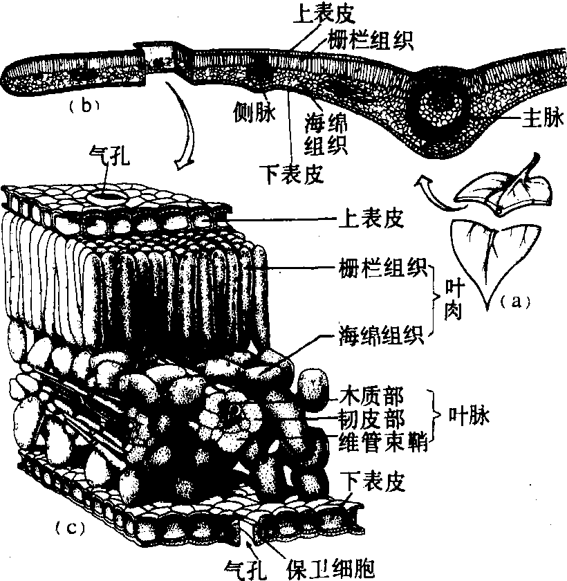 表皮 覆盖于叶片的上下表面,由排列紧密的单层扁平细胞所组成。少数植物如夹竹桃、印度橡皮树可形成多层细胞结构的复表皮。大多数双子叶植物叶片的表皮细胞顶面观为不规则形,禾本科植物的为长方形,侧壁微具凹凸,相互嵌合。表皮细胞一般缺乏叶绿体,细胞外壁具角质膜。耐旱植物的叶角质膜很厚,形成革质的表面,或覆盖蜡质,具有减低蒸腾的作用。有些植物的表皮上分化出表皮毛或腺毛,荨麻的表皮毛尖端含有蚁酸等刺激物,毛蕊花属的表皮毛外壁甚厚,这些均为保护植物的适应性特征。禾本科植物的表皮,除一般表皮细胞外,还有短轴的硅细胞和栓细胞,以及体积较大的泡状细胞(运动细胞)。硅细胞中充满硅质胶体物,并常向外突出成刚毛。泡状细胞分布于相邻两个叶脉之间的上表皮部分,一般认为气候干燥、叶片失水、出现内卷现象与泡状细胞暂时萎蔫有关。 表皮覆盖层中,除表皮细胞外,还分布一些由成对的保卫细胞所组成的气孔器。气孔器中间的间隙称为气孔。如甘薯、水稻、玉米等禾本科植物,在保卫细胞的外侧,还有副卫细胞存在。气孔可以开关,影响气孔开关的主要因素有光线、水分、气温等。气孔的开启与关闭对调控植物体与外界之间的气体交换,以及植物体的水分蒸腾起着重要作用(见表皮)。大多数植物叶的下表皮,每平方毫米中平均气孔数为100~300个,上表皮的气孔数一般较少。木本植物叶的气孔大都分布于下表皮。着生位置越高的叶,其单位面积的气孔数有越多的趋势。双子叶植物的叶片一般较宽,具网状脉,气孔器散乱分布; 单子叶植物的叶片一般较狭长,具平行脉,气孔器顺叶的长轴平行排列。 一些植物的叶尖或叶缘部位,其表皮覆盖层分化出水孔。水孔与气孔的结构相似,也由保卫细胞合抱而成,但没有叶绿体,无膨胀收缩的能力,以致水孔长期处于开放状态。1至数个水孔与其内侧排列疏松的通水组织共同组成排水器结构,通水组织与脉梢的管胞相连,叶片中过多的水分通过水孔溢出。这种吐水现象多发生于湿热天气的夜晚,夏季清晨易观察到。吐水液中含有一些有机物(如谷氨酰铵、糖类)和无机盐类(如钙、钾和镁盐),水液干燥后,残留的溶质有时会对敏感植物的幼叶带来损害。 叶肉 叶肉是上、下表皮之间进行光合作用的薄壁组织部分。由于叶片两面受光作用不同,大多数植物的叶肉分化出栅栏组织和海绵组织。栅栏组织由1至数层长柱形细胞组成,位于叶的近轴面(腹面),紧接上表皮,细胞间隙稍小,细胞内含有许多叶绿体。海绵组织于叶的远轴面(背面),在栅栏组织下方,与下表皮毗接,细胞形状不规则,细胞内叶绿体的含量较栅栏组织略少,排列疏松,有发达的细胞间隙,它们和气孔相通,有利气体交换。这种有栅栏组织和海绵组织分化的叶,属于背腹型叶。另一些植物其叶肉没有栅栏组织和海绵组织分化。有的如丝兰、麝香石竹的叶片,上、下面都有栅栏组织,海绵组织位于中间,这类属于等面型叶。小麦等禾本科植物的叶肉细胞为不规则形状,细胞壁向内凹褶,形成“峰”、“谷”、“环”结构。小麦叶肉细胞有单环、2环、3环、多环等类型。各类叶肉细胞的分布随着叶位上升而有不同,一般在低位叶中,1~3环的叶肉细胞较多,而在高位叶中,则多环细胞增加。旗叶中4环以上的细胞可达77%。叶肉细胞的环数增加,使叶片单位体积内有较多的细胞间隙,从而扩大了光合细胞表面积,有利于加速细胞间的气体和物质的运转。旗叶的叶绿体基粒片层比低叶位的叶要多1.5~3倍,光合功能高出10~30倍。松叶的叶肉细胞其细胞壁也向内形成许多褶襞,叶绿体沿褶襞分布,扩大了光合面。 有些植物的叶肉中有乳汁管(蒲公英、橡胶树等)或树脂道(松)、分泌细胞(樟)、石细胞(茶)、含晶异细胞(柑)等分布。 叶脉 叶脉贯穿于叶肉中。叶脉的主要部分为维管束。通常包括与维管束毗接的一些薄壁组织或机械组织。主脉和大侧脉中含有一个或几个维管束,束内的木质部在近轴面,韧皮部在远轴面。双子叶植物叶的主脉内,在木质部与韧皮部之间可以出现形成层,行短暂的微弱分裂。小叶脉内部无形成层存在,机械组织逐渐减少而消失,韧皮部和木质部组成分子也渐趋减退。细脉末端保留数个狭短的筛管分子和增大的伴胞以及螺纹和环纹管胞。通常木质部分子比韧皮部分子延伸得远一些,管胞最后消失。小叶脉中,与韧皮部筛管分子和木质部管状分子毗连的一些薄壁细胞,其细胞壁可以形成内突生长结构,具有传递细胞特征,有利将叶肉组织的光合产物短途运输至筛管,同时对韧皮部与木质部之间的溶质交换也起重要作用。 小叶脉的维管束外围,通常有1~2层薄壁细胞或厚壁细胞组成的维管束鞘。有些植物有维管束鞘伸展区,使之与表皮横向相连。薄壁细胞组成的伸展区能输送水分到表皮,如伸展区为厚壁细胞组成,则主要加强机械支持作用。 C4植物和C3植物的叶片结构有明显差异。C4植物如玉米、高粱、甘蔗和莎草科、藜科、苋科的某些种类叶片的维管束鞘发达,维管束鞘细胞内含许多较大的叶绿体,虽然缺乏或仅有少量基粒片层,但积累淀粉的能力强,同时线粒体的数量比较丰富,体积较大,嵴膜结构也较复杂。C4植物在维管束鞘外面包围一或数层排列紧密的叶肉细胞,在叶片横切面呈同心圆的花环型结构。这些结构特征与C4植物表现的光呼吸低和光合效率